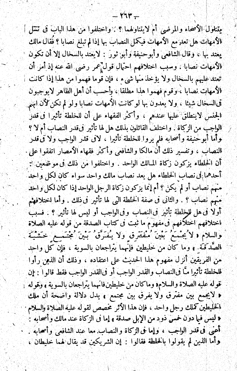 يتناول الأصحاء والمرضى أم لا يتناولهما؟. واختلفوا من هذا الباب في نسل الأمهات هل تعد مع الأمهات فيكمل النصاب بها إذا لم تبلغ نصابا؟ فقال مالك يعتد بها وقال الشافعي وأبو حنيفة وأبو ثور: لا يعتد بالسخال إلا أن تكون الأمهات نصابا. وسبب اختلافهم احتمال قول عمر رضي الله عنه إذ أمر أن تعد عليهم بالسخال ولا يؤخذ منها شيء فإن قوما فهموا من هذا إذا كانت وقوم فهموا هذا مطلقا وأحسب أن أهل الظاهر لا يوجبون في السخال شيئا ولا يعدون بها لو كانت ولو لم تكن لأن اسم الجنس لا ينطلق عليها عندهم وأكثر الفقهاء على أن للخلطة تأثيرا في قدر الواجب من الزكاة. واختلف القائلون بذلك هل لها تأثير في قدر النصاب أم لا؟ وأما أبو حنيفة وأصحابه فلم يروا للخلطة تأثيرا لا في قدر الواجب ولا في قدر النصاب وتفسير ذلك أن مالكا والشافعي وأكثر فقهاء الأمصار اتفقوا على أن الخلطاء يزكون زكاة المالك الواحد. واختلفوا من ذلك في موضعين: أحدهما في نصاب الخلطاء هل يعد نصاب مالك واحد سواء أكان لكل واحد منهم نصاب أو لم يكن؟ أم إنما يزكون زكاة الرجل الواحد إذا كان لكل واحد منهم نصاب؟. الثاني في صفة الخلطة التي لها تأثير في ذلك. وأما اختلافهم أولا في هل للخلطة تأثير في النصاب وفي الواجب أو ليس لها تأثير؟. فسبب اختلافهم اختلافهم في مفهوم ما ثبت في كتاب الصدقة من قوله عليه الصلاة والسلام: "لا يجمع بين مفترق ولا يفرق بين مجتمع خشية الصدقة" وما كان من خليطين فإنهما يتراجعان بالسوية فإن كل واحد من صليت أنزل مفهوم هذا الحديث على اعتقاده وذلك أن الذين رأوا للخلطة تأثيرا ما في النصاب والقدر الواجب أو في القدر الواجب فقط قالوا: إن قوله عليه الصلاة والسلام: "وما كان من خليطين فإنهما يتراجعان بالسوية" وقوله: "لا يجمع بين مفترق ولا يفرق بين مجتمع" يدل دلالة واضحة أن ملك الخليطين كملك رجل واحد فإن هذا الأثر مخصص لقوله عليه الصلاة والسلام: "ليس فيما دون خمس ذود من الإبل صدقة" إما في الزكاة عند مالك وأصحابه: أعني في قدر الواجب وإما في الزكاة والنصاب معا عند الشافعي وأصحابه. وأما الذين لم يقولوا بالخلطة فقالوا: إن الشريكين قد يقال لهما خليطان,