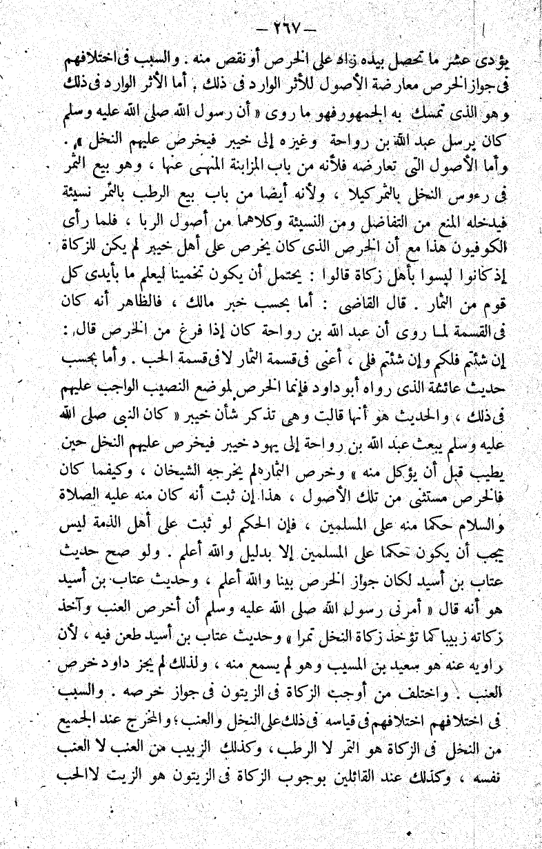 يؤدي عشر ما تحصل بيده زاد على الخرص أو نقص منه. والسبب في اختلافهم في جواز الخرص معارضة الأصول للأثر الوارد في ذلك. أما الأثر الوارد في ذلك وهو الذي تمسك به الجمهور فهو ما روي أن رسول الله صلى الله عليه وسلم كان يرسل عبد الله بن رواحة وغيره إلى خيبر فيخرص عليهم النخل. وأما الأصول التي تعارضه فلأنه من باب المزابنة المنهي عنها وهو بيع الثمر في رؤوس النخل بالثمر كيلا ولأنه أيضا من باب بيع الرطب بالتمر نسيئة فيدخله المنع من التفاضل ومن النسيئة وكلاهما من أصول الربا فلما رأى الكوفيون هذا مع أن الخرص الذي كان يخرص على أهل خيبر لم يكن للزكاة إذ كانوا ليسوا بأهل زكاة قالوا: يحتمل أن يكون تخمينا ليعلم ما بأيدي كل قوم من الثمار. قال القاضي. أما بحسب خبر مالك فالظاهر أنه كان في القسمة لما روي أن عبد الله بن رواحة كان إذ فرغ من الخرص قال: إن شئتم فلكم وإن شئتم فلي أعني في قسمة الثمار لا في قسمة الحب. وأما بحسب حديث عائشة الذي رواه أبو داود فإنما الخرص لموضع النصيب الواجب عليهم في ذلك والحديث هو أنها قالت وهي تذكر شأن خيبر كان النبي صلى الله عليه وسلم يبعث عبد الله بن رواحة إلى زفر خيبر فيخرص عليهم النخل حين يطيب قبل أن يؤكل منه وخرص الثمار لم يخرجه الشيخان وكيفما كان فالخرص مستثنى من تلك الأصول هذا إن ثبت أنه كان منه عليه الصلاة والسلام حكما منه على المسلمين فإن الحكم لو ثبت على أهل الذمة ليس يجب أن يكون حكما عاما على المسلمين إلا بدليل والله أعلم. ولو صح حديث عتاب بن أسيد لكان جواز الخرص بينا والله أعلم وحديث عتاب بن أسيد هو أنه قال أمرني رسول الله صلى الله عليه وسلم أن أخرص العنب وآخذ زكاته زبيبا كما تؤخذ زكاة النخل تمرا وحديث عتاب بن أسيد طعن فيه لأن راويه عنه هو سعيد بن المسيب وهو لم يسمع منه ولذلك لم يجز داود خرص العنب. واختلف من أوجب الزكاة في الزيتون في جواز خرصه. والسبب في اختلافهم اختلافهم في قياسه في ذلك على النخل والعنب والمخرج عند الجميع من النخل في الزكاة هو التمر لا الرطب وكذلك الزبيب من العنب لا العنب نفسه وكذلك عند القائلين بوجوب الزكاة في الزيتون هو الزيت لا الحب
