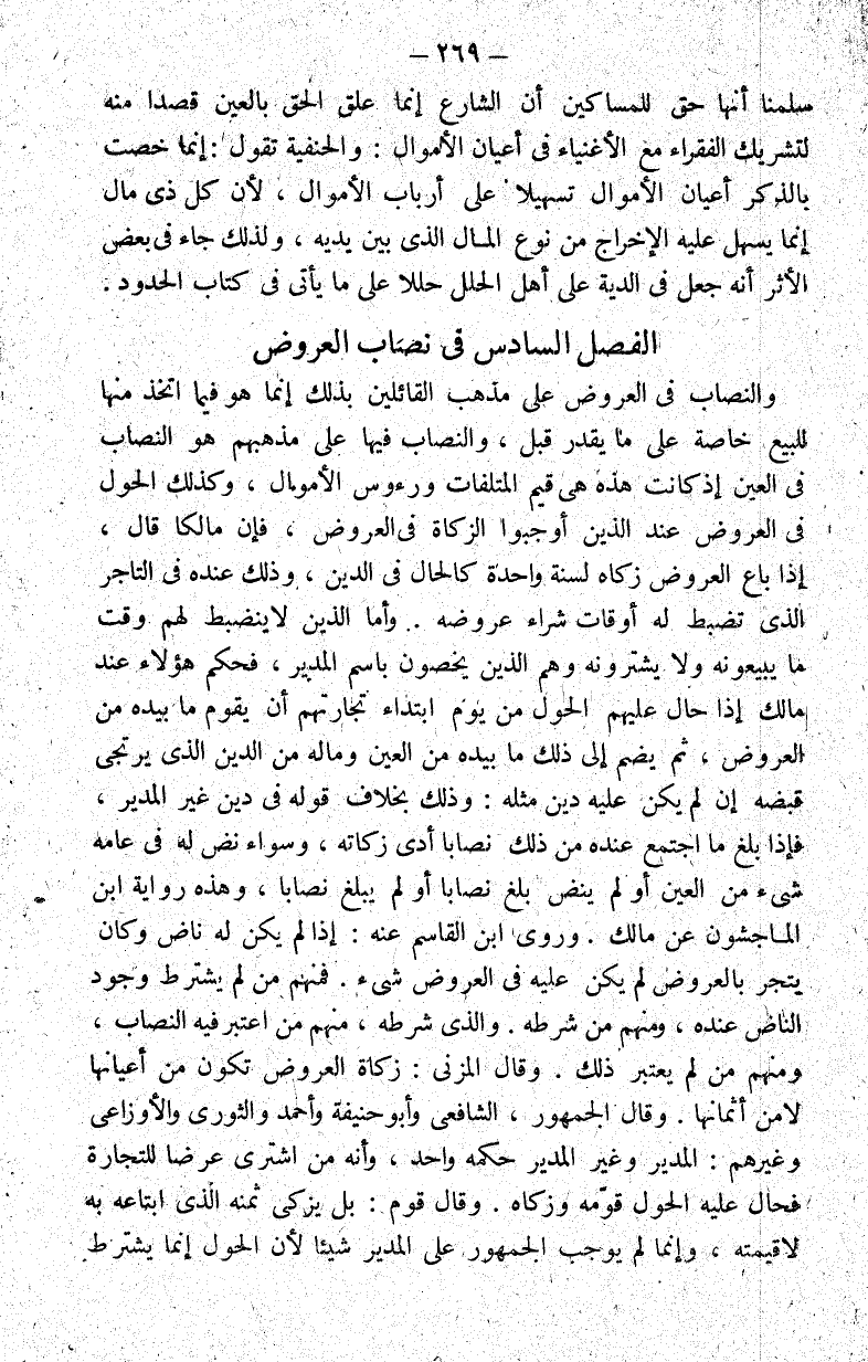 والنصاب في العروض على مذهب القائلين بذلك إنما هو فيما اتخذ منها للبيع خاصة على ما يقدر قبل والنصاب فيها على مذهبهم هو النصاب في العين إذا كانت هذه هي قيم المتلفات ورؤوس الأموال وكذلك الحول في العروض عند الذين أوجبوا الزكاة في العروض فإن مالكا قال إذا باع العروض زكاه لسنة واحدة كالحال في الدين وذلك عنده في التاجر الذي تضبط له أوقات شراء عروضه. وأما الذين لا ينضبط لهم وقت ما يبيعونه ولا يشترونه وهم الذين يخصون باسم المدير فحكم هؤلاء عند مالك إذا حال عليهم الحول من يوم ابتداء تجارتهم أن يقوم ما بيده من العروض ثم يضم إلى ذلك ما بيده من العين وماله من الدين الذي يرتجى قبضه إن لم يكن عليه دين مثله: وذلك بخلاف قوله في دين غير المدير فإذا بلغ ما اجتمع عنده من أدى زكاته وسواء نض له في عامه شيء من العين أو لم ينض أو لم وهذه رواية ابن الماجشون عن مالك. وروى ابن القاسم عنه: إذا لم يكن له ناض وكان يتجر بالعروض لم يكن عليه في العروض شيء. فمنهم من لم يشترط وجود الناض عنده ومنهم من شرطه. والذي شرطه منهم فمنهم من اعتبر فيه النصاب ومنهم من لم يعتبر ذلك. وقال المزني: زكاة العروض تكون من أعيانها لا من أثمانها. وقال الجمهور الشافعي وأبو حنيفة وأحمد والثوري والأوزاعي وغيرهم: المدير وغير المدير حكمه واحد وأنه من اشترى عرضا للتجارة فحال عليه الحول قومه وزكاه. وقال قوم: بل يزكي ثمنه الذي ابتاعه به لا قيمته وإنما لم يوجب الجمهور على المدير شيئا لأن الحول إنما يشترط