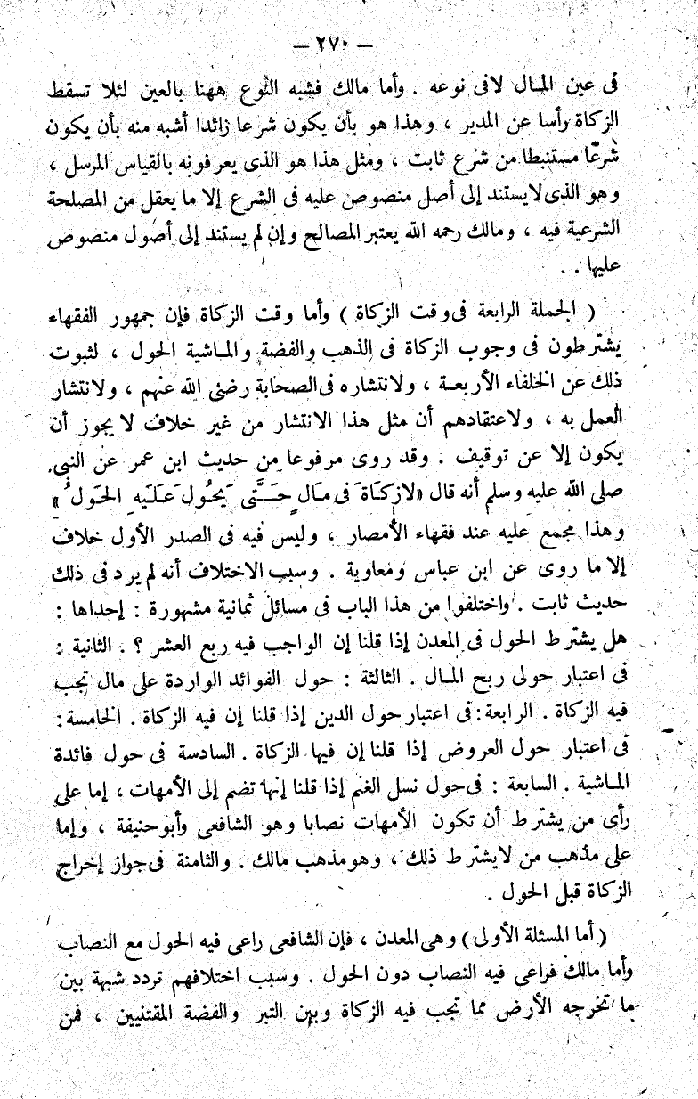 وأما وقت الزكاة فإن جمهور الفقهاء يشترطون في وجوب الزكاة في الذهب والفضة والماشية الحول لثبوت ذلك عن الخلفاء الأربعة ولانتشاره في الصحابة رضي الله عنهم ولانتشار العمل به ولاعتقادهم أن مثل هذا الانتشار من غير خلاف ولا يجوز أن يكون إلا عن توقيف. وقد روي مرفوعا من حديث ابن عمر عن النبي صلى الله عليه وسلم أنه قال: "لا زكاة في مال حتى يحول عليه الحول" وهذا مجمع عليه عند فقهاء الأمصار وليس فيه في الصدر الأول خلاف إلا ما روي عن ابن عباس ومعاوية. وسبب الاختلاف أنه لم يرد في ذلك حديث ثابت. واختلفوا من هذا الباب في مسائل ثمانية مشهورة: إحداها: هل يشترط الحول في المعدن إذا قلنا إن الواجب فيه ربع العشر؟. الثانية: في اعتبار حول ربح المال. الثالثة: حول ملكا الواردة على مال تجب فيه الزكاة. الرابعة: في اعتبار حول الدين إذا قلنا إن فيه الزكاة. الخامسة: في اعتبار حول العروض إذا قلنا إن فيها الزكاة. السادسة: في حول فائدة الماشية. السابعة: في حول نسل الغنم إذا قلنا إنها تضم إلى الأمهات إما على رأي من يشترط أن تكون وهو الشافعي وأبو حنيفة وإما على مذهب من لا يشترط ذلك وهو مذهب مالك. والثامنة: في جواز إخراج الزكاة قبل الحول.