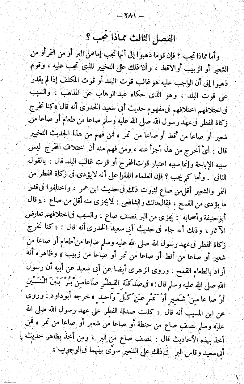 وأما مماذا تجب؟ فإن قوما ذهبوا إلى أنها تجب إما من البر أو التمر أو الشعير أو الزبيب أو الأقط وأن ذلك على التخيير للذي تجب عليه وقوم ذهبوا إلى أن الواجب عليه هو غالب قوت البلد أو قوت المكلف إذا لم يقدر على قوت البلد وهو الذي حكاه عبد الوهاب عن المذهب. والسبب في اختلافهم اختلافهم في مفهوم حديث أبي سعيد الخدري أنه قال كنا نخرج زكاة الفطر في عهد رسول الله صلى الله عليه وسلم صاعا من الطعام أو صاعا من شعير أو صاعا من أقط أو صاعا من تمر فمن فهم من هذا الحديث التخيير قال: أي أخرج من هذا أجزأ عنه ومن فهم منه أن اختلاف المخرج ليس سببه الإباحة وإنما سببه اعتبار قوت المخرج أو قوت غالب البلد قال: بالقول الثاني. وأما كم يجب؟ فإن العلماء اتفقوا على أنه لا يؤدى في زكاة الفطر من التمر والشعير أقل من صاع لثبوت ذلك في حديث ابن عمر واختلفوا في قدر ما يؤدى من القمح فقال مالك والشافعي: لا يجزى منه أقل من صاع وقال أبو حنيفة وأصحابه: يجزى من البر نصف صاع. والسبب في اختلافهم تعارض الآثار وذلك أنه جاء في حديث أبي سعيد الخدري أنه قال: كنا نخرج زكاة الفطر في عهد رسول الله صلى الله عليه وسلم صاعا من طعام أو صاعا من شعير أو صاعا من أقط أو صاعا من تمر أو صاعا من زبيب وظاهره أنه أراد بالطعام القمح. وروى الزهري أيضا عن أبي سعيد عن أبيه أن رسول الله صلى الله عليه وسلم قال: "في صدقة الفطر صاعا من بر بين اثنين أو صاعا من شعير أو تمر عن كل واحد" خرجه أبو داود. وروي عن ابن المسيب أنه قال: كانت صدقة الفطر على عهد رسول الله صلى الله عليه وسلم نصف صاع من حنطة أو صاعا شعير أو صاعا من تمر فمن أخذ بهذه الأحاديث قال: نصف صاع من البر ومن أخذ بظاهر حديث أبي سعيد وقاس البر في ذلك على الشعير سوى بينهما في الوجوب.