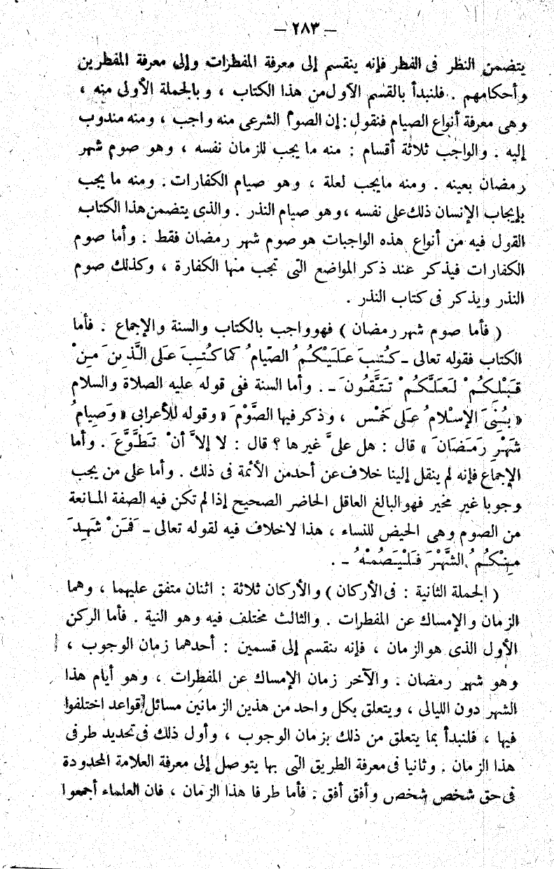 في الأركان والأركان ثلاثة: اثنان متفق عليهما وهما الزمان والإمساك عن المفطرات. والثالث مختلف فيه وهو النية.