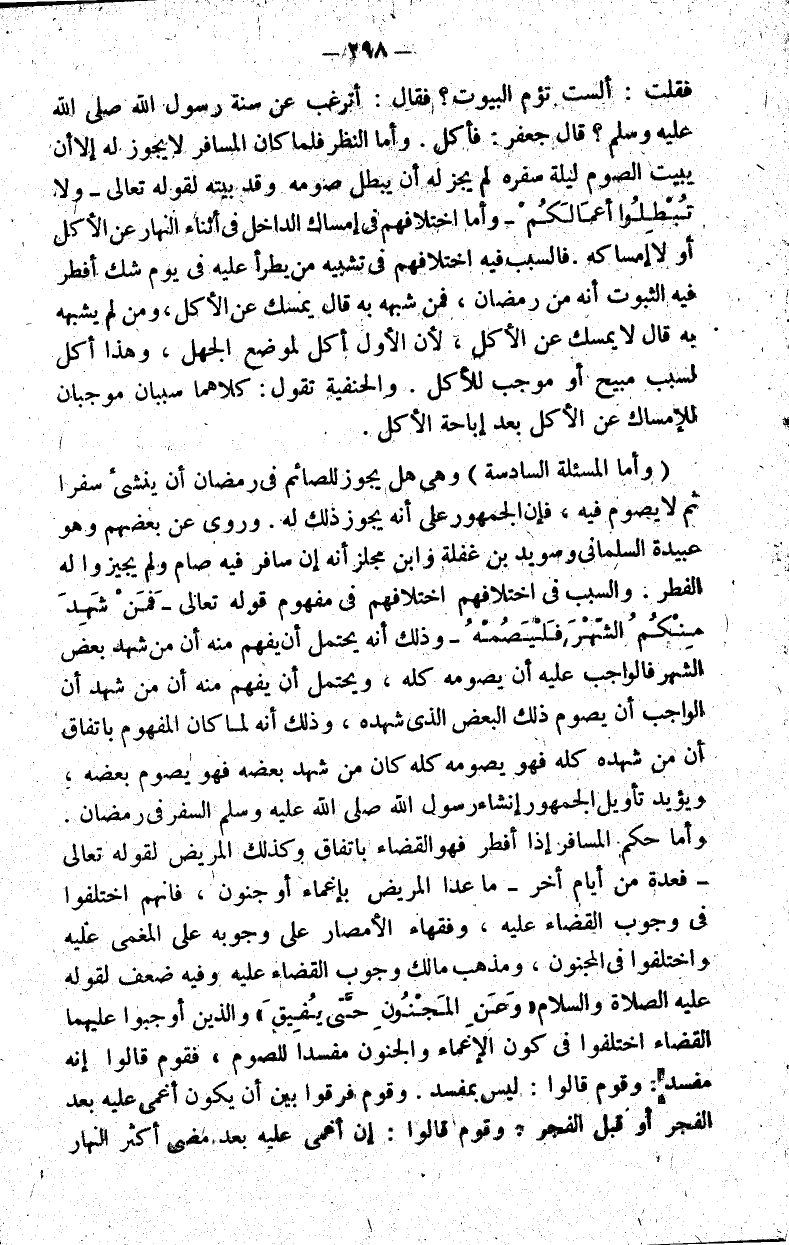فقال: ألست تؤم البيوت؟ فقال: أترغب عن سنة رسول الله صلى الله عليه وسلم؟ قال جعفر: فأكل. وأما النظر فلما كان المسافر لا يجوز له إلا أن يبيت الصوم ليلة سفره لم يجز له أن يبطل صومه وقد بيته لقوله تعالى: {وَلا تُبْطِلُوا أَعْمَالَكُمْ} وأما اختلافهم في إمساك الداخل في أثناء النهار عن الأكل أو لا إمساكه. فالسبب فيه اختلافهم في تشبيه من يطرأ عليه في يوم شك أفطر فيه الثبوت أنه من رمضان فمن شبهه به قال يمسك عن الأكل ومن لم يشبهه به قال لا يمسك عن الأكل لأن الأول أكل موضع الجهل وهذا أكل لسبب مبيح أو موجب للأكل. والحنفية تقول: كلاهما سببان موجبان للإمساك عن الأكل بعد إباحة الأكل.