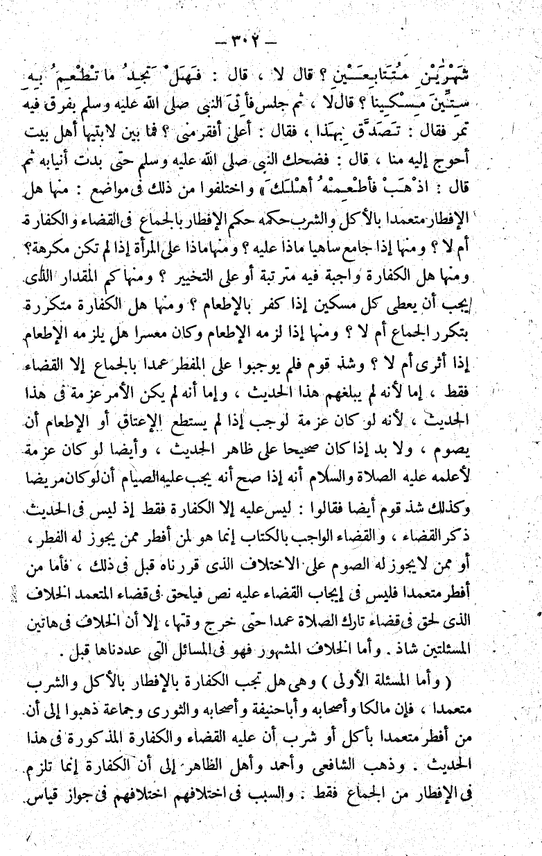 الشهرين متتابعين؟" قال: لا قال: "فهل تجد ما تطعم به ستين مسكينا؟" قال: لا ثم جلس فأتي النبي صلى الله عليه وسلم بفرق فيه تمر فقال: "تصدق بهذا" فقال: أعلى أفقر مني؟ فما بين لابتتها أهل بيت أحوج إليه منه قال: فضحك النبي صلى الله عليه وسلم حتى بدت أنيابه ثم قال: "اذهب فأطعمه أهلك" واختلفوا من ذلك في مواضع: منها هل الإفطار متعمدا بالأكل والشرب حكمه حكم الإفطار بالجماع في القضاء والكفارة أم لا؟ ومنها إذا جامع ساهيا ماذا عليه؟ ومنها ماذا على المرأة إذا لم تكن مكرهة؟ ومنها هل الكفارة واجبة فيه مترتبة أو على التخيير؟ ومنها كم المقدار الذي يجب أن يعطى كل مسكين إذا كفر بالإطعام؟ ومنها هل الكفارة متكررة بتكرر الجماع أم لا؟ ومنها إذا لزمه الإطعام وكان معسرا هل يلزمه الإطعام إذا أثرى أم لا؟ وشذ قوم فلم يوجبوا على المفطر عمدا بالجماع إلا القضاء فقط إما لأنه لم يبلغهم هذا الحديث وإما لأنه لم يكن الأمر عزمة في هذا الحديث لأنه لو كان عزمة لوجب إذا لم يستطع الإعتاق أو الإطعام أن يصوم ولا بد إذا كان صحيحا على ظاهر الحديث وأيضا لو كان عزمة لأعلمه عليه الصلاة والسلام أنه إذا صح أنه يجب عليه الصيام أن لو كان مريضا وكذلك شذ قوم أيضا فقالوا: ليس عليه الكفارة فقط إذ ليس في الحديث ذكر القضاء والقضاء الواجب بالكتاب إنما هو لمن أفطر ممن يجوز له الفطر أو ممن لا يجوز له الصوم على الاختلاف الذي قررناه قبل في ذلك فأما من أفطر متعمدا فليس في إيجاب القضاء عليه نص فيلحق في قضاء المتعمد الخلاف الذي لحق في قضاء تارك الصلاة عمدا حتى خرج وقتها إلا أن الخلاف في هاتين المسألتين شاذ. وأما الخلاف المشهور فهو في المسائل التي عددناها قبل.