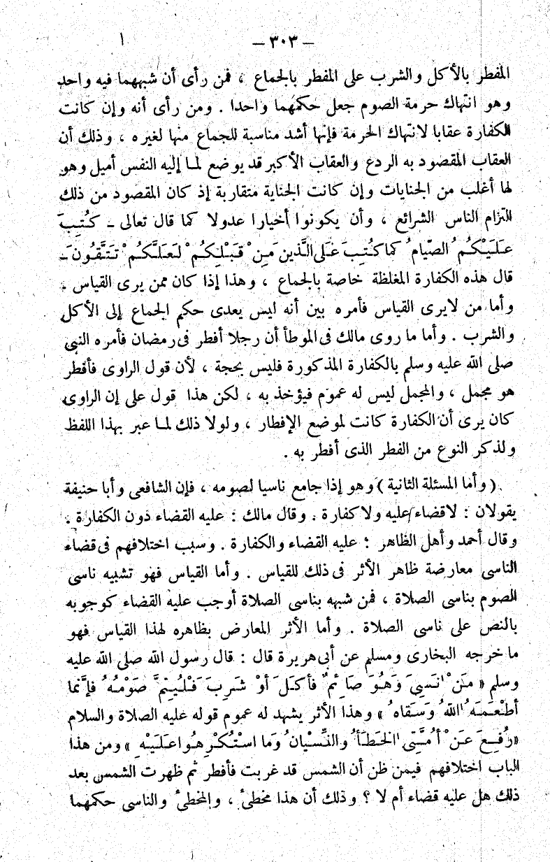 المفطر بالأكل والشرب وعلى المفطر بالجماع فمن رأى أن شبههما فيه واحد وهو انتهاك حرمة الصوم جعل حكمهما واحدا. ومن رأى أنه وإن كانت الكفارة عقابا لانتهاك الحرمة فإنها أشد مناسبة للجماع منها لغيره وذلك أن العقاب المقصود به الردع قد يوضع لما إليه النفس أميل وهو لها أغلب من الجنايات وإن كانت الجناية متقاربة إذ كان المقصود من ذلك التزام الناس الشرائع وأن يكونوا أخيارا عدولا كما قال تعالى: {كُتِبَ عَلَيْكُمُ الصِّيَامُ كَمَا كُتِبَ عَلَى الَّذِينَ مِنْ قَبْلِكُمْ لَعَلَّكُمْ تَتَّقُونَ} قال هذه الكفارة المغلظة خاصة بالجماع وهذا إذا كان ممن يرى القياس. وأما من لا يرى القياس فأمره بين أنه ليس يعدي حكم الجماع إلى الأكل والشرب. وأما ما روى مالك في الموطأ أن رجلا أفطر في رمضان فأمره النبي صلى الله عليه وسلم بالكفارة المذكورة فليس بحجة لأن قول الراوي فأفطر هو مجمل والمجمل ليس له عموم فيؤخذ به لكن هذا قول على أن الراوي كان يرى أن الكفارة كانت لموضع الإفطار ولولا ذلك لما عبر بهذا اللفظ ولذكر النوع من الفطر الذي أفطر به.