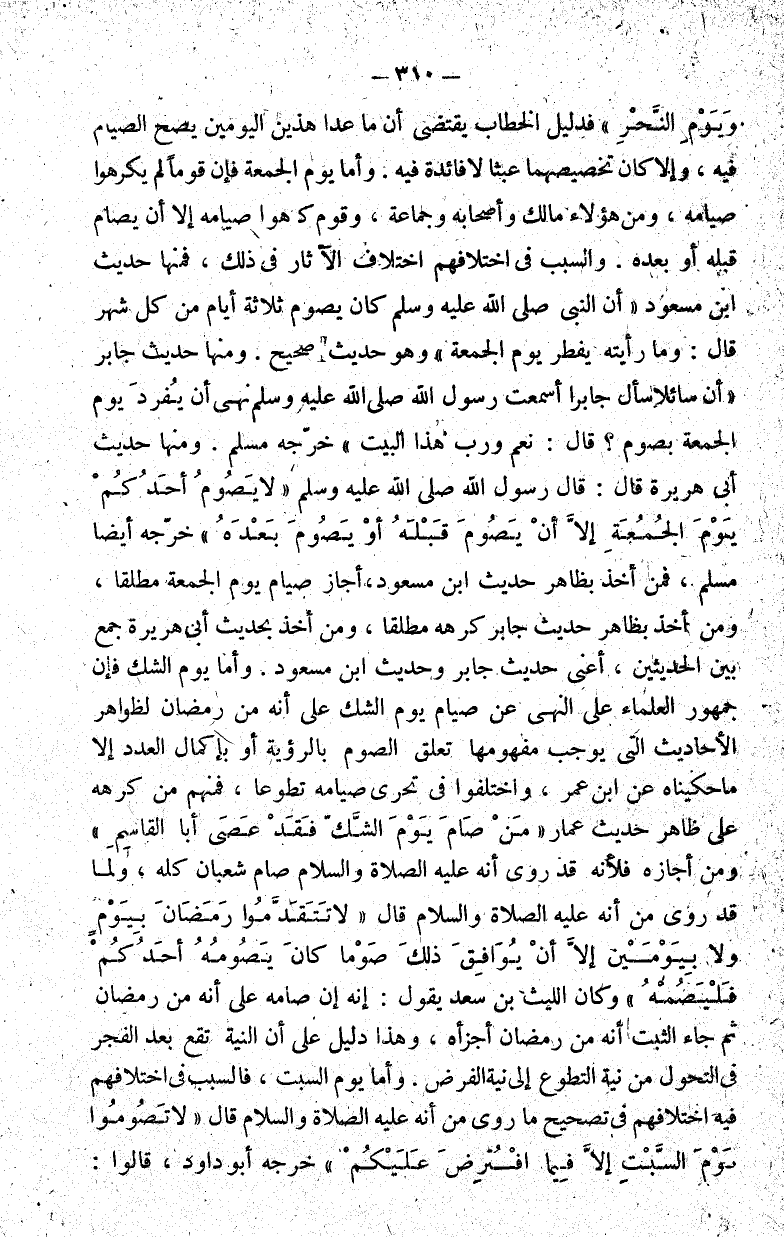 ويوم النحر" فدليل الخطاب يقتضي أن ما عدا هذين اليومين يصح الصيام فيه وإلا كان تخصيصهما عبثا لا فائدة فيه. وأما يوم الجمعة فإن قوما لم يكرهوا صيامه ومن هؤلاء مالك وأصحابه وجماعة وقوم كرهوا صيامه إلا أن يصام قبله أو بعده. والسبب في اختلافهم اختلاف الآثار في ذلك فمنها حديث ابن مسعود أن النبي صلى الله عليه وسلم كان يصوم ثلاثة أيام من كل شهر قال: وما رأيته يفطر يوم الجمعة وهو حديث صحيح. ومنها حديث جابرأن سائلا سأل جابرا أسمعت رسول الله صلى الله عليه وسلم نهى أن يفرد يوم الجمعة بصوم؟ قال: نعم ورب هذا البيت خرجه مسلم. ومنها حديث أبي هريرة قال: قال رسول الله صلى الله عليه وسلم: "لا يصوم أحدكم يوم الجمعة إلا أن يصوم قبله أو يصوم بعده" خرجه أيضا مسلم فمن أخذ بظاهر حديث ابن مسعود أجاز صيام يوم الجمعة مطلقا ومن أخذ بظاهر حديث جابر كرهه مطلقا ومن أخذ بحديث أبي هريرة جمع بين الحديثين أعني حديث جابر وحديث ابن مسعود. وأما يوم الشك فإن جمهور العلماء على النهي عن صيام يوم الشك على أنه من رمضان لظواهر الأحاديث التي يوجب مفهومها تعلق الصوم بالرؤية أو بإكمال العد إلا ما حكيناه عن ابن عمر واختلفوا في تحري صيامه تطوعا فمنهم من كرهه على ظاهر حديث عمار: من صام يوم الشك فقد عصى أبا القاسم ومن أجازه فلأنه قد روي أنه عليه الصلاة والسلام صام شعبان كله ولما قد روي أنه عليه الصلاة والسلام قال: "لا تتقدموا رمضان بيوم ولا بيومين إلا أن يوافق ذلك صوما كان يصومه أحدكم فليصمه" كان الليث بن سعد يقول: إنه إن صامه على أنه من رمضان ثم جاءه الثبت أنه من رمضان أجزأه وهذا دليل على أن النية تقع بعد الفجر في التحول من نية التطوع إلى نية الفرض. وأما يوم السبت فالسبب في اختلافهم فيه اختلافهم في تصحيح ما روي من أنه عليه الصلاة والسلام قال: "لا تصوموا يوم السبت إلا فيما افترض عليكم" خرجه أبو داود قالوا: