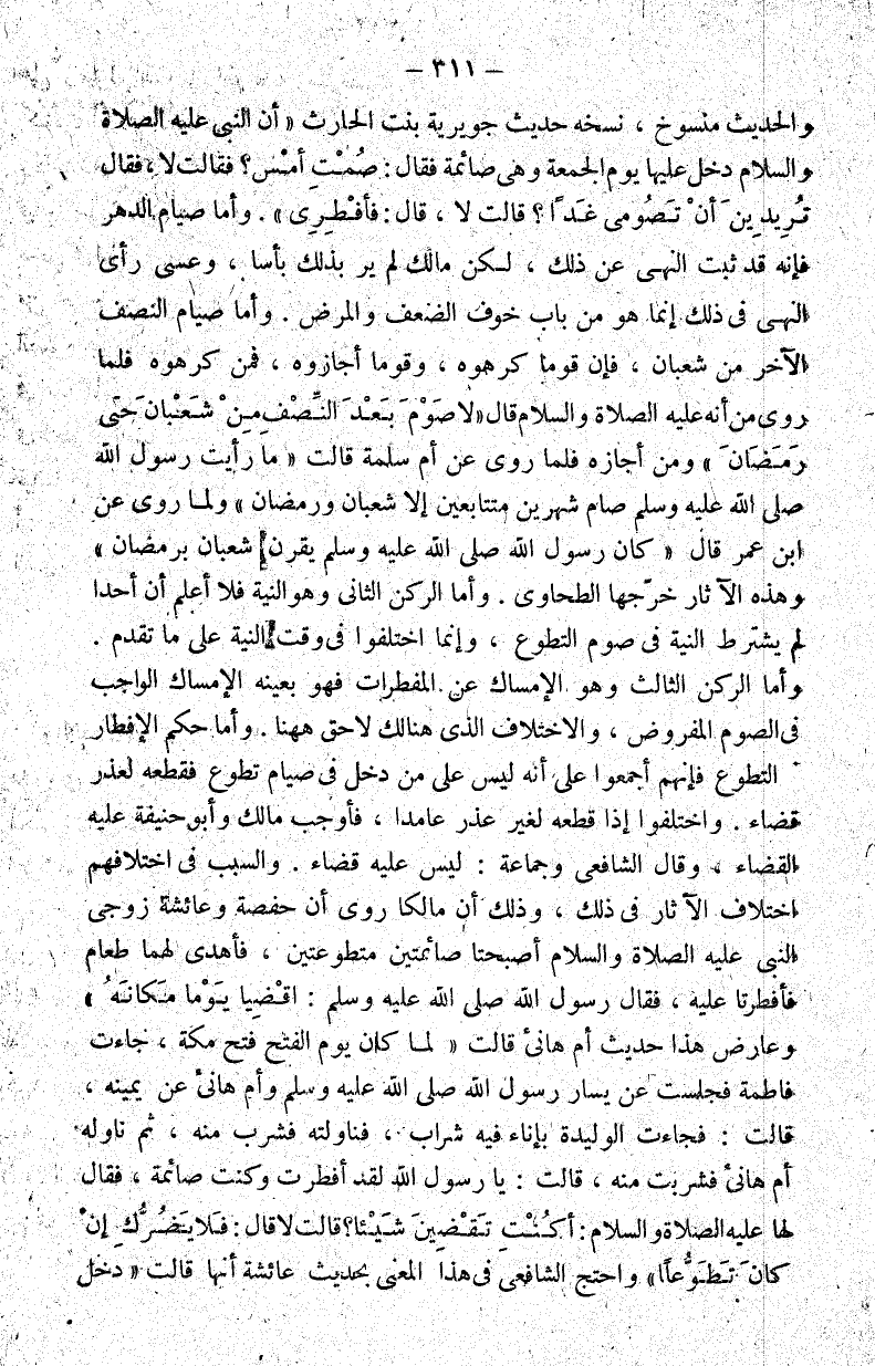 والحديث منسوخ نسخه حديث جويرية بنت الحارث أن النبي عليه الصلاة والسلام دخل عليها يوم الجمعة وهي صائمة فقال: "صمت أمس؟" فقالت: لا فقال: "تريدين أن تصومي غدا ؟" قالت: لا قال: "فأفطري" . وأما صيام الدهر فإنه قد ثبت النهي عن ذلك لكن مالكا لم ير بذلك بأسا وعسى رأي النهي في ذلك إنما هو من باب خوف الضعف والمرض. وأما صيام النصف الآخر من شعبان فإن قوما كرهوه وقوما أجازوه فمن كرهوه فلما روي من أنه عليه الصلاة والسلام قال: "لا صوم بعد النصف من شعبان حتى رمضان" ومن أجازه فلما روي عن أم سلمة قالت: ما رأيت رسول الله صلى الله عليه وسلم صام شهرين متتابعين إلا شعبان ورمضان ولما روي عن ابن عمر قال: كان رسول الله صلى الله عليه وسلم يقرن شعبان برمضان وهذه الآثار خرجها الطحاوي. وأما الركن الثاني وهو النية فلا أعلم أن أحدا لم يشترط النية في صوم التطوع وإنما اختلفوا في وقت النية على ما تقدم. وأما الركن الثالث وهو الإمساك عن المفطرات فهو بعينه الإمساك الواجب في الصوم المفروض والاختلاف الذي هنالك لاحق هاهنا. وأما حكم الإفطار في التطوع فإنهم أجمعوا على أنه ليس على من دخل في صيام تطوع فقطعه لعذر قضاء. واختلفوا إذا قطعه لغير عذر عامدا فأوجب مالك وأبو حنيفة عليه القضاء. وقال الشافعي وجماعة: ليس عليه قضاء. والسبب في اختلافهم اختلاف الآثار في ذلك وذلك أن مالكا روى أن حفصة وعائشة زوجي النبي عليه الصلاة والسلام أصبحتا صائمتين متطوعتين فأهدي لهما طعام فأفطرتا عليه فقال رسول الله صلى الله عليه وسلم: "اقضيا يوما مكانه" وعارض هذا حديث أم هانئ قالت: لما كان يوم الفتح فتح مكة جاءت فاطمة فجلست عن يسار رسول الله صلى الله عليه وسلم وأم هانئ عن يمينه قالت: فجاءت الوليدة بإناء فيه شراب فناولته فشرب منه ثم ناول أم هانئ فشربت منه قالت: يا رسول الله لقد أفطرت وكنت صائمة فقال لها عليه الصلاة والسلام: "أكنت تقضين شيئا؟" قالت: لا قال: "فلا يضرك إن كان تطوعا" واحتج الشافعي في هذا المعنى بحديث عائشة أنها قالت: دخل