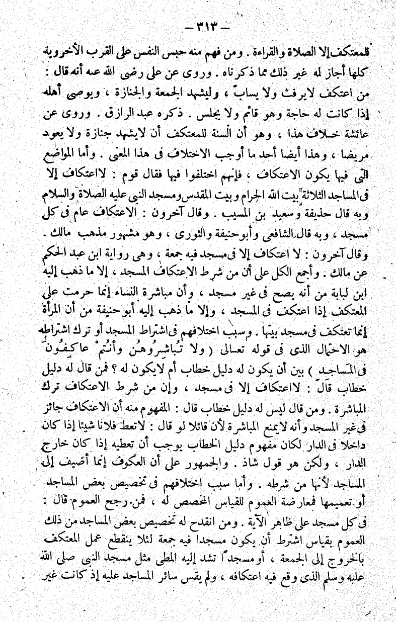 للمعتكف إلا الصلاة والقراءة. ومن فهم منه حبس النفس الأخروية كلها أجاز له غير ذلك مما ذكرناه. وروي عن علي رضي الله عنه أنه قال: من اعتكف لا يرفث ولا يساب وليشهد الجمعة والجنازة ويوصي أهله إذا كانت له حاجة وهو قائم ولا يجلس. ذكره عبد الرزاق. وروي عن عائشة خلاف هذا وهو أن السنة للمعتكف أن لا يشهد جنازة ولا يعود مريضا وهذا أيضا أحد ما أوجب الاختلاف في هذا المعنى. وأما المواضع التي فيها يكون الاعتكاف فإنهم اختلفوا فيها فقال قوم: لا اعتكاف إلا في المساجد الثلاثة بيت الله الحرام وبيت المقدس ومسجد النبي عليه الصلاة والسلام وبه قال حذيفة و سعيد بن المسيب. وقال آخرون: الاعتكاف عام في كل مسجد وبه قال الشافعي وأبو حنيفة والثوري وهو مشهور مذهب مالك. وقال آخرون: لا اعتكاف إلا في مسجد فيه جمعة وهي رواية ابن عبد الحكم عن مالك. وأجمع الكل على أن من شرط الاعتكاف المسجد إلا ما ذهب إليه ابن لبابة من أنه يصح في غير المسجد وأن مباشرة النساء إنما حرمت على المعتكف إذا اعتكف في المسجد وإلا ما ذهب إليه أبو حنيفة من أن المرأة إنما تعتكف في مسجد بيتها. وسبب اختلافهم في اشتراط المسجد أو ترك اشتراطه هو الاحتمال الذي في قوله تعالى: {وَلا تُبَاشِرُوهُنَّ وَأَنْتُمْ عَاكِفُونَ فِي الْمَسَاجِدِ} بين أن يكون له دليل خطاب أم لا يكون له؟ فمن قال له دليل خطاب قال: لا اعتكاف إلا في مسجد وإن من شرط الاعتكاف ترك المباشرة. ومن قال ليس له دليل خطاب قال: المفهوم منه أن الاعتكاف جائز في غير المسجد وأنه لا يمنع المباشرة لأن قائلا لو قال: لا تعط فلانا شيئا إذا كان داخلا في الدار لكن مفهوم دليل الخطاب يوجب أن تعطيه إذا كان خارج الدار ولكن هو قول شاذ. والجمهور على أن العكوف إنما أضيف إلى المساجد لأنها من شرطه. وأما سبب اختلافهم في تخصيص بعض المساجد أو تعميمها فمعارضة العموم للقياس المخصص له فمن رجح العموم قال: في كل مسجد على ظاهر الآية. ومن انقدح له تخصيص بعض المساجد من ذلك العموم بقياس اشترط أن يكون مسجدا فيه جمعة لئلا ينقطع عمل المعتكف بالخروج إلى الجمعة أو مسجدا تشد إليه المطي مثل مسجد النبي صلى الله عليه وسلم الذي وقع فيه اعتكافه ولم يقس سائر المساجد عليه إذا كانت غير
