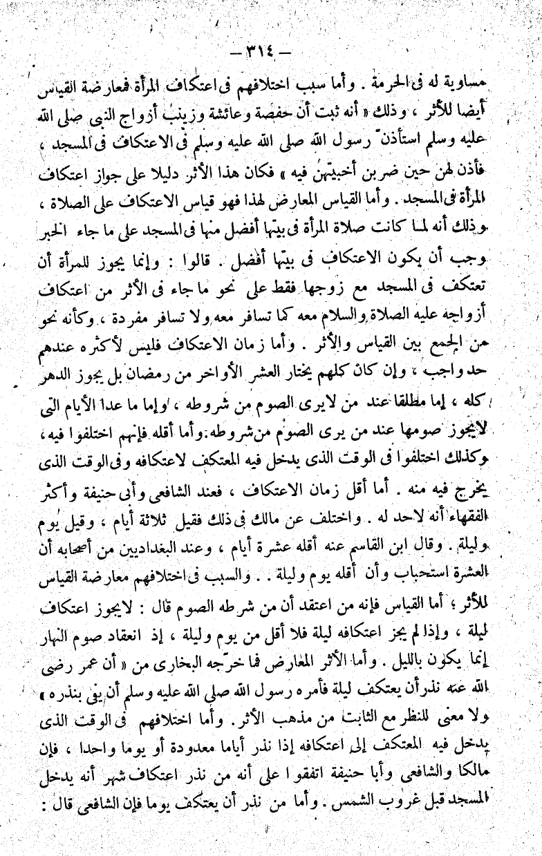 مساوية له في الحرمة. وأما سبب اختلافهم في اعتكاف المرأة فمعارضة القياس أيضا للأثر وذلك أنه ثبت أن حفصة وعائشة وزينب أزواج النبي صلى الله عليه وسلم استأذن رسول الله صلى الله عليه وسلم في الاعتكاف في المسجد فأذن لهن حين ضربن أخبيتهن فيه فكان هذا الأثر دليلا على جواز اعتكاف المرأة في المسجد. وأما القياس المعارض لهذا فهو قياس الاعتكاف على الصلاة وذلك أنه لما كانت صلاة المرأة في بيتها أفضل منها في المسجد على ما جاء في الخبر وجب أن يكون الاعتكاف في بيتها أفضل. قالوا: وإنما يجوز للمرأة أن تعتكف في المسجد مع زوجها فقط على نحو ما جاء في الأثر من اعتكاف أزواجه عليه الصلاة والسلام معه كما تسافر معه ولا تسافر مفردة وكأنه نحو من الجمع بين القياس والأثر. وأما زمان الاعتكاف فليس لأكثره عندهم حد واجب وإن كان كلهم يختار العشر الأواخر من رمضان بل يجوز الدهر كله إما مطلقا عند من لا يرى الصوم من شروطه وإما ما عدا الأيام التي لا يجوز صومها عند من يرى الصوم من شروطه. وأما أقله فإنهم اختلفوا فيه وكذلك اختلفوا في الوقت الذي يدخل فيه المعتكف لاعتكافه وفي الوقت الذي يخرج فيه منه. أما أقل زمان الاعتكاف فعند الشافعي وأبي حنيفة وأكثر الفقهاء أنه لا حد له. واختلف عن مالك في ذلك فقيل ثلاثة أيام وقيل يوم وليلة. وقال ابن القاسم عنه أقله عشرة أيام وعند البغدادين من أصحابه أن العشرة استحباب وأن أقله يوم وليلة. والسبب في اختلافهم معارضة القياس للأثر أما القياس فإنه من اعتقد أن من شرطه الصوم قال: لا يجوز اعتكاف ليلة وإذا لم يجز اعتكافه ليلة فلا أقل من يوم وليلة إذ انعقاد صوم النهار إنما يكون بالليل. وأما الأثر المعارض فما خرجه البخاري من أن عمر رضي الله عنه نذر أن يعتكف ليلة فأمره رسول الله صلى الله عليه وسلم أن يفي بنذره ولا معنى للنظر مع الثابت من مذهب الأثر. وأما اختلافهم في الوقت الذي يدخل فيه المعتكف إلى اعتكافه إذا نذر أياما معدودة أو يوما واحدا فإن مالكا والشافعي وأبا حنيفة اتفقوا على أنه من نذر اعتكاف شهر أنه يدخل المسجد قبل غروب الشمس. وأما من نذر أن يعتكف يوما فإن الشافعي قال: