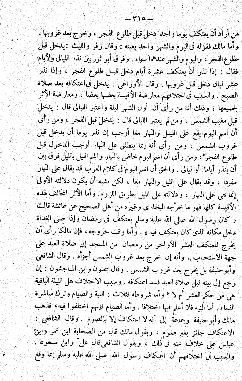 من أراد أن يعتكف يوما واحدا دخل قبل طلوع الفجر وخرج بعد غروبها. وأما مالك فقوله في اليوم والشهر واحد بعينه. وقال زفر والليث: يدخل قبل طلوع الفجر واليوم والشهر عندهما سواء. وفرق أبو ثور بين نذر الليالي والأيام فقال: إذا نذر أن يعتكف عشرة أيام دخل قبل طلوع الفجر وإذا نذر عشر ليال دخل قبل غروبها. وقال الأوزاعي: يدخل في اعتكافه بعد صلاة الصبح. والسبب في اختلافهم معارضة الأقيسة بعضها بعضا ومعارضة الأثر لجميعها وذلك أنه من رأى أن أول الشهر ليله واعتبر الليالي قال: يدخل قبل مغيب الشمس ومن لم يعتبر الليال قال: يدخل قبل الفجر ومن رأى أن اسم اليوم يقع على الليل والنهار معا أوجب إن نذر يوما أن يدخل قبل غروب الشمس ومن رأى أنه إنما ينطلق على النهار أوجب الدخول قبل طلوع الفجر ومن رأى أن اسم اليوم خاص بالنهار واسم الليل بالليل فرق بين أن ينذر أياما أو ليالي. والحق أن اسم اليوم في كلام العرب قد يقال على النهار مفردا وقد يقال على الليل والنهار معا لكن يشبه أن يكون دلالته الأولى إنما هي على النهار ودلالته على الليل بطريق اللزوم. وأما الأثر المخالف لهذه الأقيسة كلها فهو ما خرجه البخاري وغيره من أهل الصحيح عن عائشة قالت: كان رسول الله صلى الله عليه وسلم يعتكف في رمضان وإذا صلى الغداة دخل مكانه الذي كان يعتكف فيه. وأما وقت خروجه فإن مالكا رأى أن يخرج المعتكف العشر الأواخر من رمضان من المسجد إلى صلاة العيد على جهة الاستحباب وأنه إن خرج بعد غروب الشمس أجزأه. وقال الشافعي وأبو حنيفة بل يخرج بعد غروب الشمس. وقال سحنون وابن الماجشون: إن رجع إلى بيته قبل صلاة العيد فسد اعتكافه. وسبب الاختلاف هل الليلة الباقية هي من حكم العشر أم لا؟ وأما شروطه فثلاثة: النية والصيام وترك مباشرة النساء. أما النية فلا أعلم فيها اختلافا. وأما الصيام فإنهم اختلفوا فيه فذهب مالك وأبو حنيفة وجماعة إلى أنه لا اعتكاف إلا بالصوم. وقال الشافعي: الاعتكاف جائز بغير صوم وبقول مالك قال من الصحابة ابن عمر وابن عباس على خلاف عنه في ذلك وبقول الشافعي قال علي وابن مسعود. والسبب في اختلافهم أن اعتكاف رسول الله صلى الله عليه وسلم إنما وقع