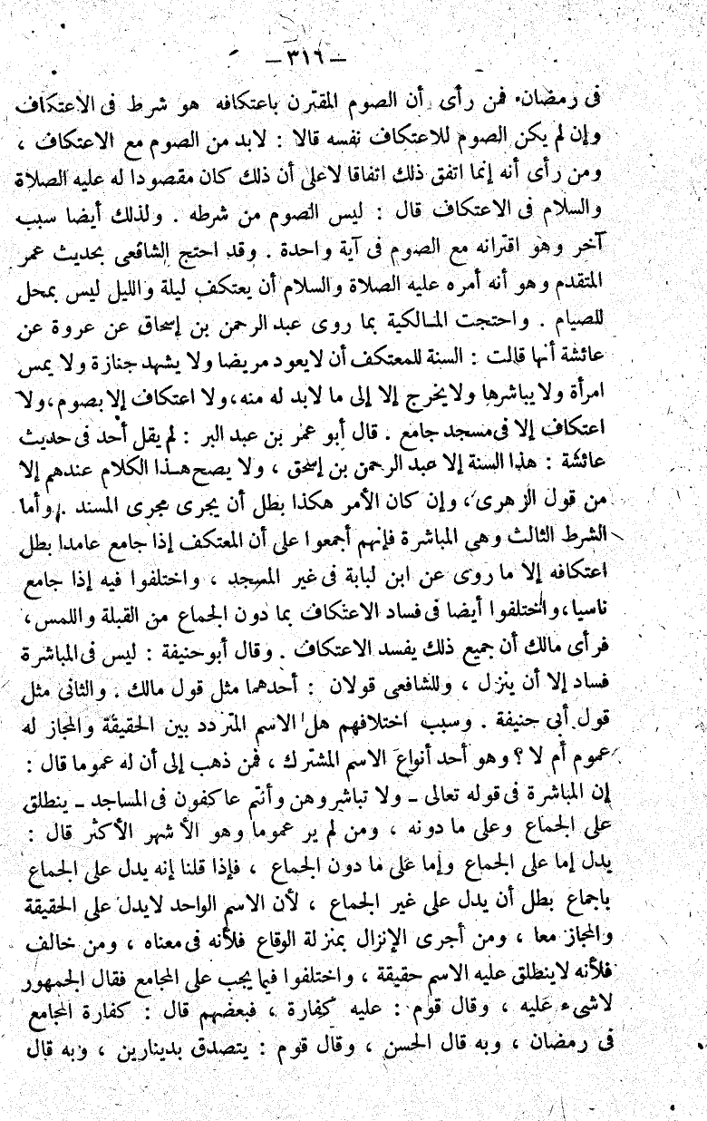 في رمضان فمن رأى أن الصوم المقترن باعتكافه هو شرط في الاعتكاف وإن لم يكن الصوم للاعتكاف نفسه قالا: لا بد من الصوم مع الاعتكاف ومن رأى أنه إنما اتفق ذلك اتفاقا لا على أن ذلك كان مقصودا له عليه الصلاة والسلام في الاعتكاف قال: ليس الصوم من شرطه. ولذلك أيضا سبب آخر وهو اقترانه مع الصوم في آية واحدة. وقد احتج الشافعي بحديث عمر المتقدم وهو أنه أمره عليه الصلاة والسلام أن يعتكف ليلة والليل ليس بمحل للصيام. واحتجت المالكية بما روى عبد الرحمن بن إسحاق عن عروة عن عائشة أنها قالت: السنة للمعتكف أن لا يعود مريضا ولا يشهد جنازة ولا يمس امرأة ولا يباشرها ولا يخرج إلا ما لا بد له منه ولا اعتكاف إلا بصوم ولا اعتكاف إلا في مسجد جامع. قال أبو عمر ابن عبد البر: لم يقل أحد في حديث عائشة: هذا السنة إلا عبد الرحمن بن إسحاق ولا يصح هذا الكلام عندهم إلا من قول الزهري وإن كان الأمر هكذا بطل أن يجري مجرى المسند. وأما الشرط الثالث وهي المباشرة فإنهم أجمعوا على أن المعتكف إذا جامع عامدا بطل اعتكافه إلا ما روي عن ابن لبابة في غير المسجد واختلفوا فيه إذا جامع ناسيا واختلفوا أيضا في فساد الاعتكاف بما دون الجماع من القبلة واللمس فرأى مالك أن جميع ذلك يفسد الاعتكاف. وقال أبو حنيفة: وليس في المباشرة فساد إلا أن ينزل وللشافعي قولان: أحدهما مثل قول مالك. والثاني مثل قول أبي حنيفة. وسبب اختلافهم هل الاسم المتردد بين الحقيقة والمجاز له عموم أم لا؟ وهو أحد أنواع الاسم المشترك فمن ذهب إلى أن له عموما قال: إن المباشرة في قوله تعالى: {وَلا تُبَاشِرُوهُنَّ وَأَنْتُمْ عَاكِفُونَ فِي الْمَسَاجِدِ} ينطلق على الجماع وما دونه ومن لم ير عموما وهو الأشهر الأكثر قال: يدل إما على الجماع وإما على ما دون الجماع فإذا قلنا إنه يدل على الجماع بإجماع بطل أن يدل على غير الجماع لأن الاسم الواحد لا يدل على الحقيقة والمجاز معا ومن أجرى الإنزال بمنزلة الوقاع فلأنه في معناه ومن خالف فلأنه لا ينطلق عليه الاسم حقيقة واختلفوا فيما يجب على المجامع فقال الجمهور لا شيء عليه وقال قوم: عليه كفارة فبعضهم قال: كفارة المجامع في رمضان وبه قال الحسن وقال قوم: يتصدق بدينارين وبه قال