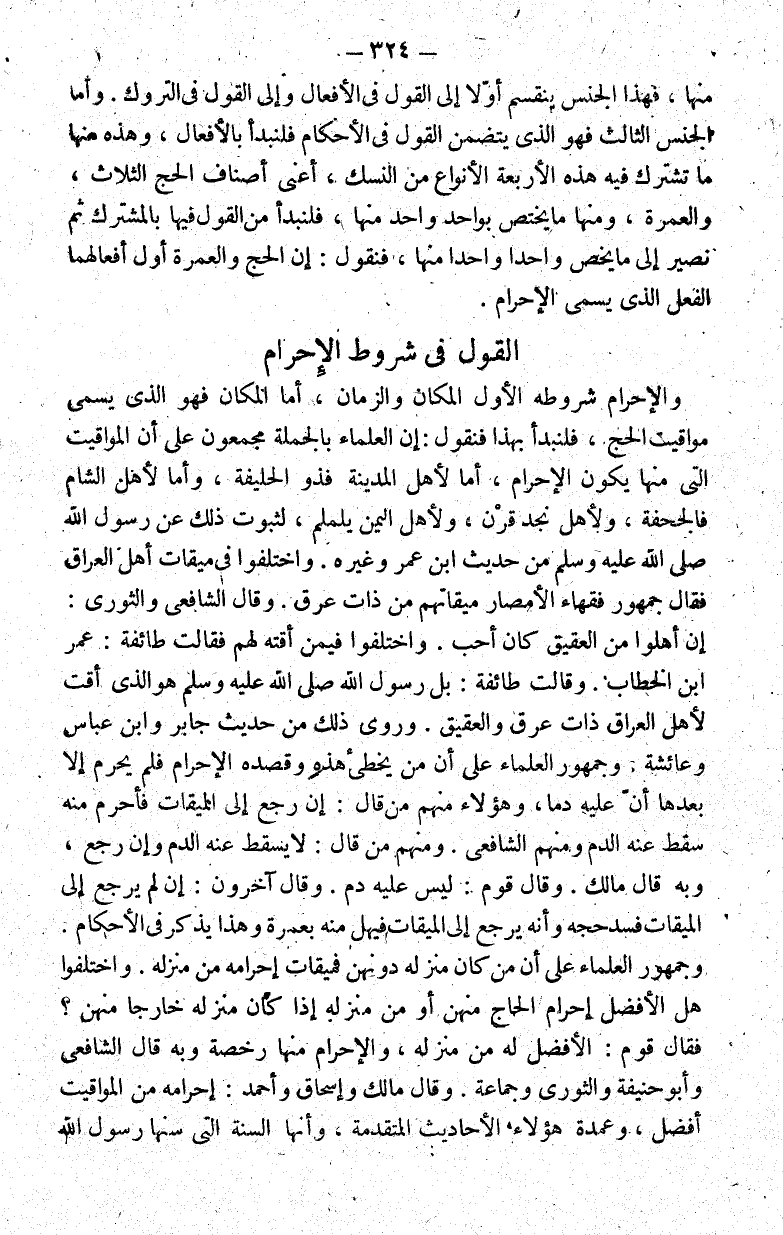 والإحرام شروطه الأول المكان والزمان أما المكان فهو الذي يسمى مواقيت الحج فلنبدأ بهذا فنقول: إن العلماء بالجملة مجمعون على أن المواقيت التي منها يكون الإحرام أما لأهل المدينة فذو الحليفة وأما لأهل الشام فالجحفة ولأهل نجد قرن وأهل اليمن يلملم لثبوت ذلك عن رسول الله صلى الله عليه وسلم من حديث ابن عمر وغيره. واختلفوا في ميقات أهل العراق فقال جمهور فقهاء الأمصار ميقاتهم من ذات عرق. وقال الشافعي والثوري: إن أهلوا من العقيق كان أحب. واختلفوا فيمن أقته لهم فقالت طائفة: عمر بن الخطاب. وقالت طائفة: بل رسول الله صلى الله عليه وسلم هو الذي أقت لأهل العراق ذات عرق والعقيق. وروي ذلك من حديث جابر وابن عباس وعائشة وجمهور العلماء على أن من يخطئ هذه وقصده الإحرام فلم يحرم إلا بعدها أن عليه دما وهؤلاء منهم من قال: إن رجع إلى الميقات فأحرم منه سقط عنه الدم ومنهم الشافعي. ومنهم من قال: لا يسقط عنه الدم وإن رجع وبه قال مالك. وقال قوم: ليس عليه دم. وقال آخرون: إن لم يرجع إلى الميقات فسد حجه وأنه يرجع إلى الميقات فيهل منه بعمرة وهذا يذكر في الأحكام. وجمهور العلماء على أن من كان منزله دونهن فميقات إحرامه من منزله. واختلفوا هل الأفضل إحرام الحاج منهن أو من منزله إذا كان منزله خارجا منهن؟ فقال قوم: الأفضل له من منزله والإحرام منها رخصة وبه قال الشافعي وأبو حنيفة والثوري وجماعة. وقال مالك وإسحق وأحمد: إحرامه من المواقيت أفضل وعمدة هؤلاء الأحاديث المتقدمة وأنها السنة التي سنها رسول الله