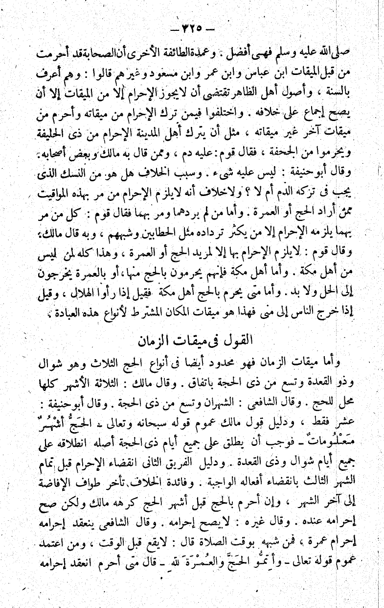 وأما ميقات الزمان فهو محدود أيضا في أنواع الحج الثلاث وهو شوال وذو القعدة وتسع من ذي الحجة باتفاق. وقال مالك: الثلاث الأشهر كلها محل للحج. وقال الشافعي: الشهران وتسع من ذي الحجة. وقال أبو حنيفة: عشر فقط ودليل قول مالك عموم قوله سبحانه وتعالى: {الْحَجُّ أَشْهُرٌ مَعْلُومَاتٌ} فوجب أن يطلق على جميع أيام ذي الحجة أصله انطلاقه على جميع أيام شوال وذي القعدة. ودليل الفريق الثاني انقضاء الإحرام قبل تمام الشهر الثالث بانقضاء أفعاله الواجبة. وفائدة الخلاف تأخر طواف الإفاضة إلى آخر الشهر وإن أحرم بالحج قبل أشهر الحج كرهه مالك ولكن صح إحرامه عنده. وقال غيره: لا يصح إحرامه. وقال الشافعي ينعقد إحرامه إحرام عمرة فمن شبهه بوقت الصلاة قال: لا يقع قبل الوقت ومن اعتمد عموم قوله تعالى: {وَأَتِمُّوا الْحَجَّ وَالْعُمْرَةَ لِلَّهِ} قال متى أحرم انعقد إحرامه