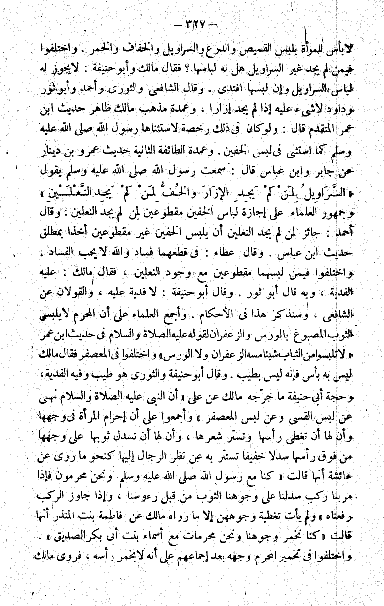 لا بأس للمرأة بلبس القميص والدرع والسراويل والخفاف والخمر. واختلفوا فيمن لم يجد غير السراويل هل له لباسها؟ فقال مالك وأبو حنيفة: لا يجوز له لباس السراويل وإن لبسها افتدى. وقال الشافعي والثوري وأحمد وأبو ثور وداود: لا شيء عليه إذا لم يجد إزارا وعمدة مذهب مالك ظاهر حديث ابن عمر المتقدم قال: ولو كان في ذلك رخصة لاستثناها رسول الله صلى الله عليه وسلم كما استثنى في لبس الخفين. وعمدة الطائفة الثانية حديث عمرو بن دينار عن جابر وابن عباس قال: سمعت رسول الله صلى الله عليه وسلم يقول: "السراويل لمن لم يجد الإزار والخف لمن لم يجد النعلين" وجمهور العلماء على إجازة لباس الخفين مقطوعين لمن لم يجد النعلين. وقال أحمد: جائز لمن لم يجد النعلين أن يلبس الخفين غير مقطوعين أخذا بمطلق حديث ابن عباس. وقال عطاء: في قطعهما فساد والله لا يحب الفساد. واختلفوا فيمن لبسهما مقطوعين مع وجود النعلين فقال مالك: عليه الفدية وبه قال أبو ثور. وقال أبو حنيفة: لا فدية عليه والقولان عن الشافعي وسنذكر هذا في الأحكام. وأجمع العلماء على أن المحرم لا يلبس الثوب المصبوغ بالورس والزعفران لقوله عليه الصلاة والسلام في حديث ابن عمر: "لا تلبسوا من الثياب شيئا مسه الزعفران ولا الورس" واختلفوا في المعصفر فقال مالك: ليس به بأس فإنه ليس بطيب. وقال أبو حنيفة والثوري: هو طيب وفيه الفدية وحجة أبي حنيفة ما خرجه مالك عن علي أن النبي عليه الصلاة والسلام نهى عن لبس القسي وعن لبس المعصفر وأجمعوا على أن إحرام المرأة في وجهها وأن لها أن تغطي رأسها وتستر شعرها وأن لها أن تسدل ثوبها على وجهها من فوق رأسها سدلا خفيفا تستر به عن نظر الرجال إليها كنحو ما روي عن عائشة أنها قالت: كنا مع رسول الله صلى الله عليه وسلم ونحن محرمون فإذا مر بنا ركب سدلنا على وجوهنا الثوب من قبل رؤوسنا وإذا جاوز الركب رفعناه ولم يأت تغطية وجوههن إلا ما رواه مالك عن فاطمة بنت المنذر أنها قالت: كنا نخمر وجوهنا ونحن محرمات مع أسماء بنت أبي بكر الصديق. واختلفوا في تخمير المحرم وجهه بعد إجماعهم على أنه لا يخمر رأسه فروى مالك