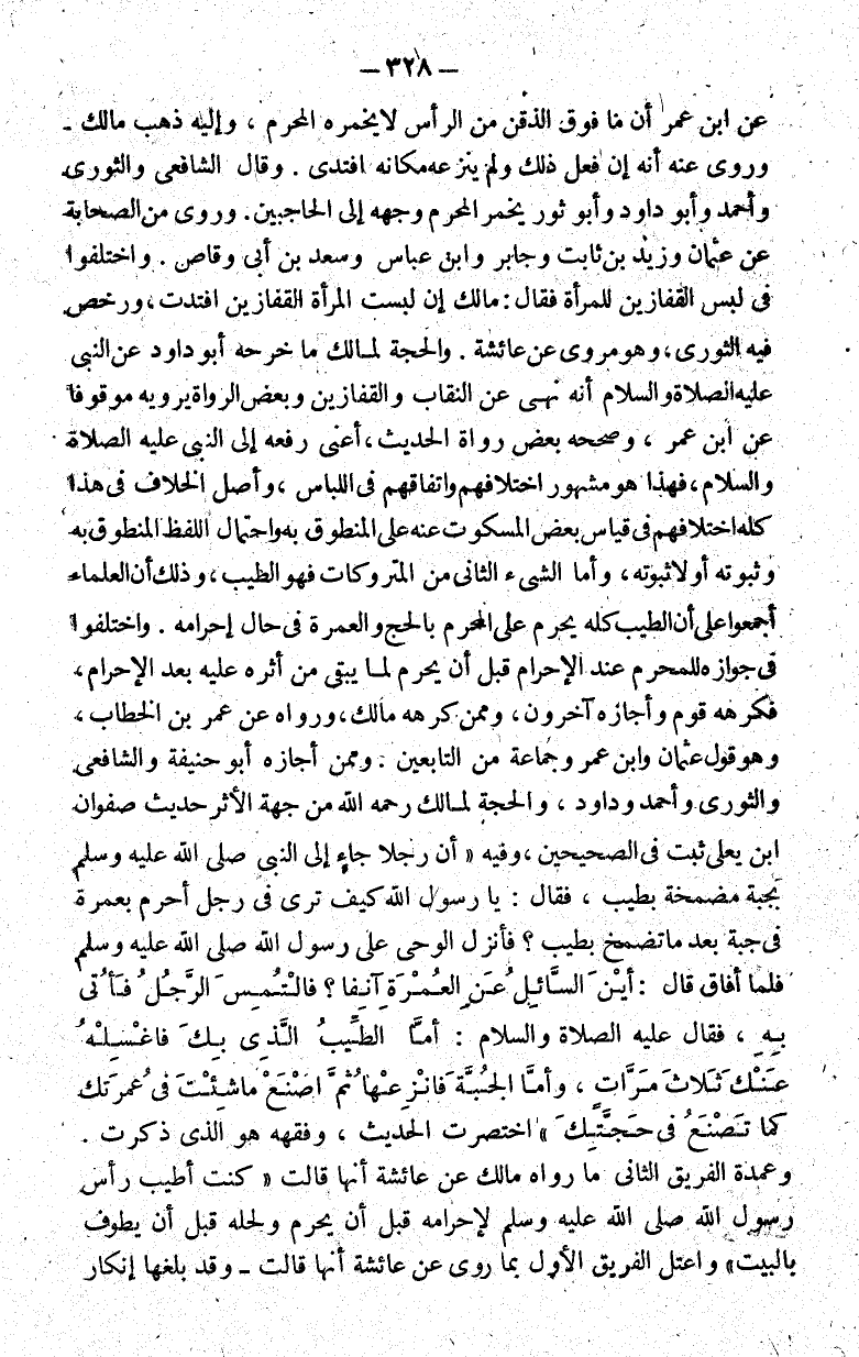 عن ابن عمر أن ما فوق الذقن من الرأس لا يخمره المحرم وإليه ذهب مالك. وروي عنه أنه إن فعل ذلك ولم ينزعه من مكانه افتدى. وقال الشافعي والثوري وأحمد وأبو داود وأبو ثور يخمر المحرم وجهه إلى الحاجبين. وروي من الصحابة عن عثمان وزيد بن ثابت وجابر وابن عباس وسعد بن أبي وقاص. واختلفوا في لبس القفازين للمرأة فقال: مالك إن لبست المرأة القفازين افتدت ورخص فيه الثوري وهو مروي عن عائشة. والحجة لمالك ما خرجه أبو داود عن النبي عليه الصلاة والسلام أنه نهى عن النقاب والقفازين وبعض الرواة يرويه موقوفا عن ابن عمر وصححه بعض رواة الحديث أعني رفعه إلى النبي عليه الصلاة والسلام فهذا هو مشهور اختلافهم واتفاقهم في اللباس وأصل الخلاف في هذا كله اختلافهم في قياس بعض المسكون عنه على المنطوق به واحتمال اللفظ المنطوق به وثبوته أو لا ثبوته وأما الشيء الثاني من المتروكات فهو الطيب وذلك أن العلماء أجمعوا على أن الطيب كله يحرم على المحرم بالحج والعمرة في حال إحرامه. واختلفوا في جوازه للمحرم عند الإحرام قبل أن يحرم لما يبقى من أثره عليه بعد الإحرام فكرهه قوم وأجازه آخرون وممن كرهه مالك ورواه عن عمر بن الخطاب وهو قول عثمان وابن عمر وجماعة من التابعين. وممن أجازه أبو حنيفة والشافعي والثوري وأحمد وداود والحجة لمالك رحمه الله من جهة الأثر حديث صفوان بن يعلى ثبت في الصحيحين وفيه أن رجلا جاء إلى النبي صلى الله عليه وسلم بجبة مضمخة بطيب فقال: يا رسول الله كيف ترى في رجل أحرم بعمرة في جبة بعدما تضمخ بطيب؟ فأنزل الوحي على رسول الله صلى الله عليه وسلم فلما أفاق قال: "أين السائل عن العمرة آنفا؟ " فالتمس الرجل فأتي به فقال عليه الصلاة والسلام: "أما الطيب الذي بك فاغسله عنك ثلاث مرات وأما الجبة فانزعها ثم اصنع ما شئت في عمرتك كما تصنع في حجتك" اختصرت الحديث وفقهه هو الذي ذكرت. وعمدة الفريق الثاني ما رواه مالك عن عائشة أنها قالت: كنت أطيب رأس رسول الله صلى الله عليه وسلم لإحرامه قبل أن يحرم ولحله قبل أن يطوف بالبيت واعتل الفريق الأول بما روي عن عائشة أنها قالت: وقد بلغها إنكار