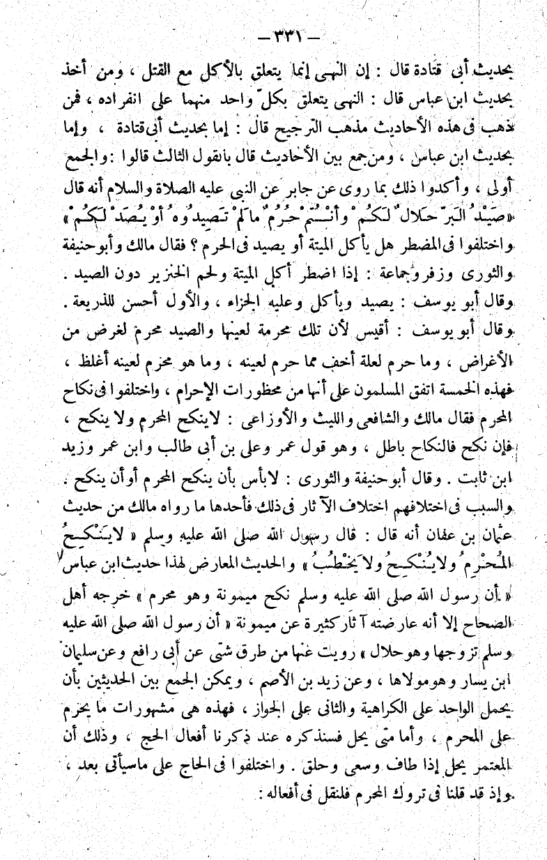 بحديث أبي قتادة قال: إن النهي إنما يتعلق بالأكل مع القتل ومن أخذ بحديث ابن عباس قال: النهي يتعلق بكل واحد منهما على انفراده فمن ذهب في هذه الأحاديث مذهب الترجيح قال: إما بحديث أبي قتادة وإما بحديث ابن عباس ومن جمع بين الأحاديث قال بالقول الثالث قالوا: والجمع أولى وأكدوا ذلك روي عن جابر عن النبي صلى الله عليه وسلم أنه قال: "صيد البر حلال لكم وأنتم حرم ما لم تصيدوه أو يصد لكم" واختلفوا في المضطر هل يأكل الميتة أو يصيد في الحرم؟ فقال مالك وأبو حنيفة والثوري وزفر وجماعة: إذا اضطر أكل الميتة ولحم الخنزير دون الصيد. وقال أبو يوسف: يصيد ويأكل وعليه الجزاء والأول أحسن للذريعة. وقول أبي يوسف: أقيس لأن تلك محرمة لعينها والصيد محرم لغرض من الأغراض وما حرم لعلة أخف مما حرم لعينه وما هو محرم لعينه أغلظ فهذه الخمسة اتفق المسلمون على أنها من محظورات الإحرام واختلفوا في نكاح المحرم فقال مالك والشافعي والليث والأوزاعي: لا ينكح المحرم ولا ينكح فإن نكح فالنكاح باطل وهو قول عمر وعلي بن أبي طالب وابن عمر وزيد بن ثابت. وقال أبو حنيفة والثوري: لا بأس بأن ينكح المحرم أو أن ينكح. والسبب في اختلافهم اختلاف الآثار في ذلك فأحدها ما رواه مالك من حديث عثمان بن عفان أنه قال: قال رسول الله صلى الله عليه وسلم: "لا ينكح المحرم ولا ينكح ولا يخطب" والحديث المعارض لهذا حديث ابن عباس أن رسول الله صلى الله عليه وسلم نكح ميمونة وهو محرم خرجه أهل الصحاح إلا أنه عارضته آثار كثيرة عن ميمونة أن رسول الله صلى الله عليه وسلم تزوجها وهو حلال رويت عنها من طرق شتى عن أبي رافع وعن سليمان بن يسار وهو مولاها وعن زيد بن الأصم ويمكن الجمع بين الحديثين بأن يحمل الواحد على الكراهية والثاني على الجواز فهذه هي مشهورات ما يحرم على المحرم وأما متى يحل فسنذكره عند ذكرنا أفعال الحج وذلك يحل إذا طاف وسعى وحلق. واختلفوا في الحاج على ما سيأتي بعد وإذ قد قلنا في تروك المحرم فلنقل في أفعاله: