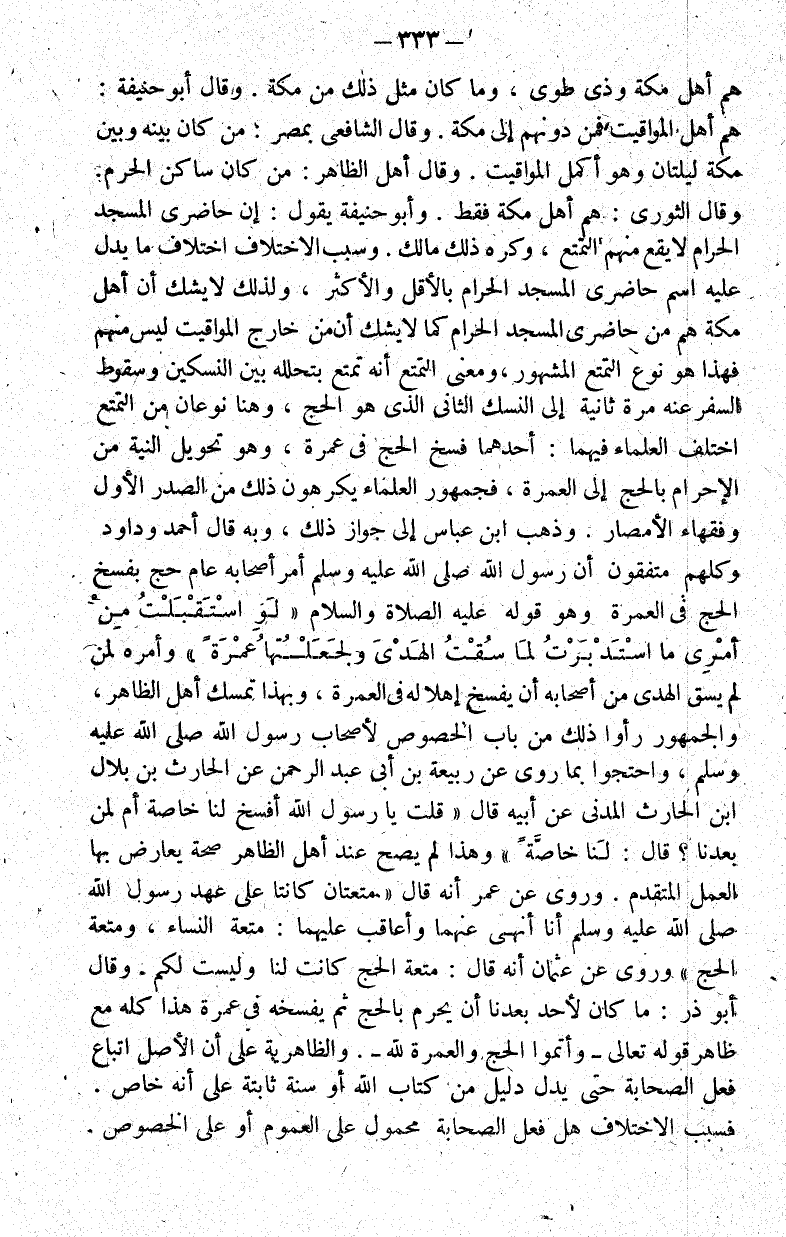هم أهل مكة وذي طوى وما كان مثل ذلك من مكة. وقال أبو حنيفة: هم أهل المواقيت فمن دونهم إلى مكة. وقال الشافعي بمصر: من كان بينه وبين مكة ليلتان وهو أكمل المواقيت. وقال أهل الظاهر: من كان ساكن الحرم. وقال الثوري: هم أهل مكة فقط. وأبو حنيفة يقول: إن حاضري المسجد الحرام لا يقع منهم التمتع وكره ذلك مالك. وسبب الاختلاف اختلاف ما يدل عليه اسم حاضري المسجد الحرام بالأقل والأكثر ولذلك لا يشك أن أهل مكة هم من حاضري المسجد الحرام كما لا يشك أن من خارج المواقيت ليس منهم فهذا هو نوع التمتع المشهور ومعنى التمتع أنه تمتع بتحلله بين النسكين وسقوط السفر عنه مرة ثانية إلى النسك الثاني الذي هو الحج وهنا نوعان من التمتع اختلف العلماء فيهما: أحدهما فسخ الحج في عمرة وهو تحويل النية من الإحرام بالحج إلى العمرة فجمهور العلماء يكرهون ذلك في الصدر الأول وفقهاء الأمصار. وذهب ابن عباس إلى جواز ذلك وبه قال أحمد وداود وكلهم متفقون أن رسول الله صلى الله عليه وسلم أمر أصحابه عام حج بفسخ الحج في العمرة وهو قوله عليه الصلاة والسلام: "لو استقبلت من أمري ما استدبرت لما سقت الهدي ولجعلتها عمرة" وأمره لمن لم يسق الهدي من أصحابه أن يفسخ إهلاله في العمرة وبهذا تمسك أهل الظاهر والجمهور رأوا ذلك من باب الخصوص لأصحاب رسول الله صلى الله عليه وسلم واحتجوا بما روي عن ربيعة بن أبي عبد الرحمن عن الحارث بن بلال بن الحارث المدني عن أبيه قال: قلت يا رسول الله أفسخ لنا خاصة أم لمن بعدنا؟ قال: "لنا خاصة" وهذا لم يصح عند أهل الظاهر صحة يعارض بها العمل المتقدم. وروي عن عمر أنه قال: متعتان كانتا على عهد رسول الله صلى الله عليه وسلم أنا أنهى عنهما وأعاقب عليهما: متعة النساء ومتعة الحج وروي عن عثمان أنه قال: متعة الحج كانت لنا وليست لكم وقال أبو ذر: ما كان لأحد بعدنا أن يحرم بالحج ثم يفسخه في عمرة هذا كله مع ظاهر قوله تعالى: {وَأَتِمُّوا الْحَجَّ وَالْعُمْرَةَ لِلَّهِ}. والظاهرية على أن الأصل اتباع فعل الصحابة حتى يدل دليل من كتاب الله أو سنة ثابتة على أنه خاص. فسبب الاختلاف هل فعل الصحابة محمول على العموم أو على الخصوص.