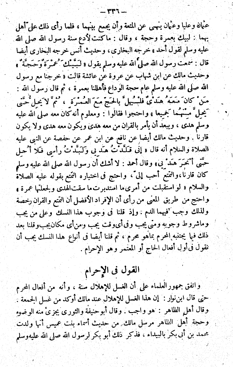 عثمان وعليا وعثمان ينهى عن المتعة وأن يجمع بينهما فلما رأى ذلك علي أهل بهما: لبيك بعمرة وحجة وقال: ما كنت لأدع سنة رسول الله صلى الله عليه وسلم لقول أحد خرجه البخاري وحديث أنس خرجه البخاري أيضا قال: سمعت رسول الله صلى الله عليه وسلم يقول: "لبيك عمرة وحجة" وحديث مالك بن شهاب عن عروة عن عائشة قالت: خرجنا مع رسول الله صلى الله عليه وسلم عام حجة الوداع فأهللنا بعمرة ثم قال رسول الله: " من كان معه هدي فليهل بالحج مع العمرة ثم لا يحل حتى يحل منهما جميعا" واحتجوا فقالوا: ومعلوم أنه كان معه صلى الله عليه وسلم هدي ويبعد أن يأمر بالقران من معه هدي ويكون معه هدي ولا يكون قارنا. وحديث مالك أيضا عن نافع عن ابن عمر عن حفصة عن النبي عليه الصلاة والسلام أنه قال: "إني قلدت هديي ولبدت رأسي فلا أحل حتى أنحر هديي" وقال أحمد: لا أشك أن رسول الله صلى الله عليه وسلم كان قارنا والتمتع أحب إلي واحتج في اختياره التمتع بقوله عليه الصلاة والسلام: "لو استقبلت من أمري ما استدبرت ما سقت الهدي ولجعلتها عمرة" واحتج من طريق المعنى من رأى أن الإفراد الأفضل أن التمتع والقران رخصة ولذلك وجب فيهما الدم. وإذ قلنا في وجوب هذا النسك وعلى من يجب وما شروط وجوبه ومتى يجب وفي أي وقت يجب ومن أي مكان يجب وقلنا بعد ذلك فيما يجتنبه المحرم بما هو محرم ثم قلنا أيضا في أنواع هذا النسك يجب أن نقول في أول أفعال الحاج وهو الإحرام.
