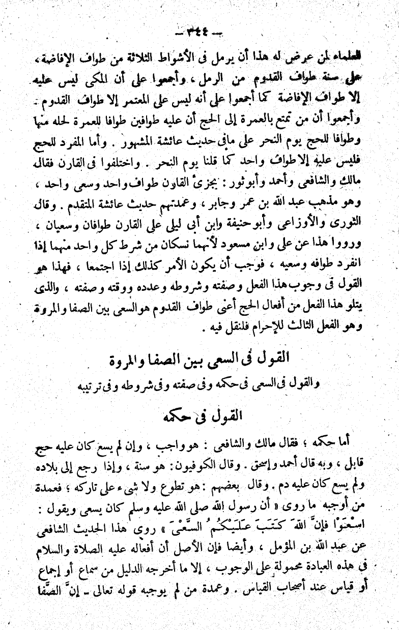 أما حكمه فقال مالك والشافعي: هو اجب وإن لم يسع كان عليه حج قابل وبه قال أحمد وإسحاق. وقال الكوفيون: هو سنة وإذا رجع إلى بلاده ولم يسع كان عليه دم. وقال بعضهم: هو تطوع ولا شي ء على تاركه فعمدة من أوجبه ما روي أن رسول الله صلى الله عليه وسلم كان يسعى ويقول: "اسعوا فإن الله كتب عليكم السعي" روى هذا الحديث الشافعي عن عبد الله بن المؤمل وأيضا فإن الأصل أن أفعاله عليه الصلاة والسلام في هذه العبادة محمولة على الوجوب إلا ما أخرجه الدليل من سماع أو إجماع أو قياس عند أصحاب القياس. وعمدة من لم يوجبه قوله تعالى: {إِنَّ الصَّفَا