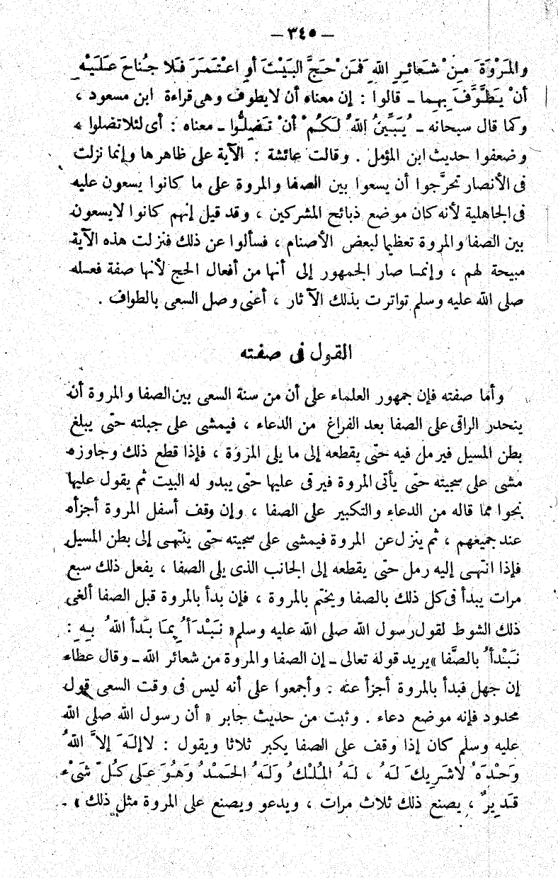 وَالْمَرْوَةَ مِنْ شَعَائِرِ اللَّهِ فَمَنْ حَجَّ الْبَيْتَ أَوِ اعْتَمَرَ فَلا جُنَاحَ عَلَيْهِ أَنْ يَطَّوَّفَ بِهِمَا} قالوا: إن معناه أن لا يطوف وهي قراءة ابن مسعود وكما قال سبحانه: {يُبَيِّنُ اللَّهُ لَكُمْ أَنْ تَضِلُّوا} معناه أي لئلا تضلوا وضعفوا حديث ابن المؤمل. وقالت عائشة: الآية على ظاهرها وإنما نزلت في الأنصار تحرجوا أن يسعوا بين الصفا والمروة على ما كانوا يسعون عليه في الجاهلية لأنه كان موضع ذبائح المشركين وقد قيل إنهم كانوا لا يسعون بين الصفا والمروة تعظيما لبعض الأصنام فسألوا عن ذلك فنزلت هذه الآية مبيحة لهم وإنما صار الجمهور إلى أنها من أفعال الحج لأنها صفة فعله صلى الله عليه وسلم تواترت بذلك الآثار أعني وصل السعي بالطواف.