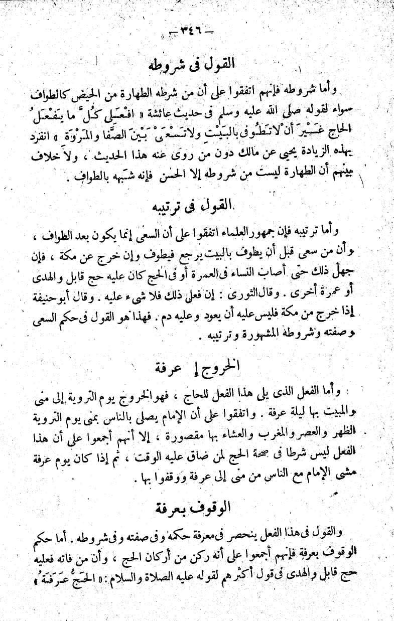 وأما شروطه فإنهم اتفقوا على أن من شرطه الطهارة من الحيض كالطواف سواء لقوله صلى الله عليه وسلم في حديث عائشة: "افعلي كل ما يفعل أن لا تطوفي بالبيت ولا تسعي بين الصفا والمروة" انفرد بهذه الزيادة يحيى عن مالك دون من روى عنه هذا الحديث ولا خلاف بينهم أن الطهارة ليست من شروطه إلا الحسن فإنه شبهه بالطواف.