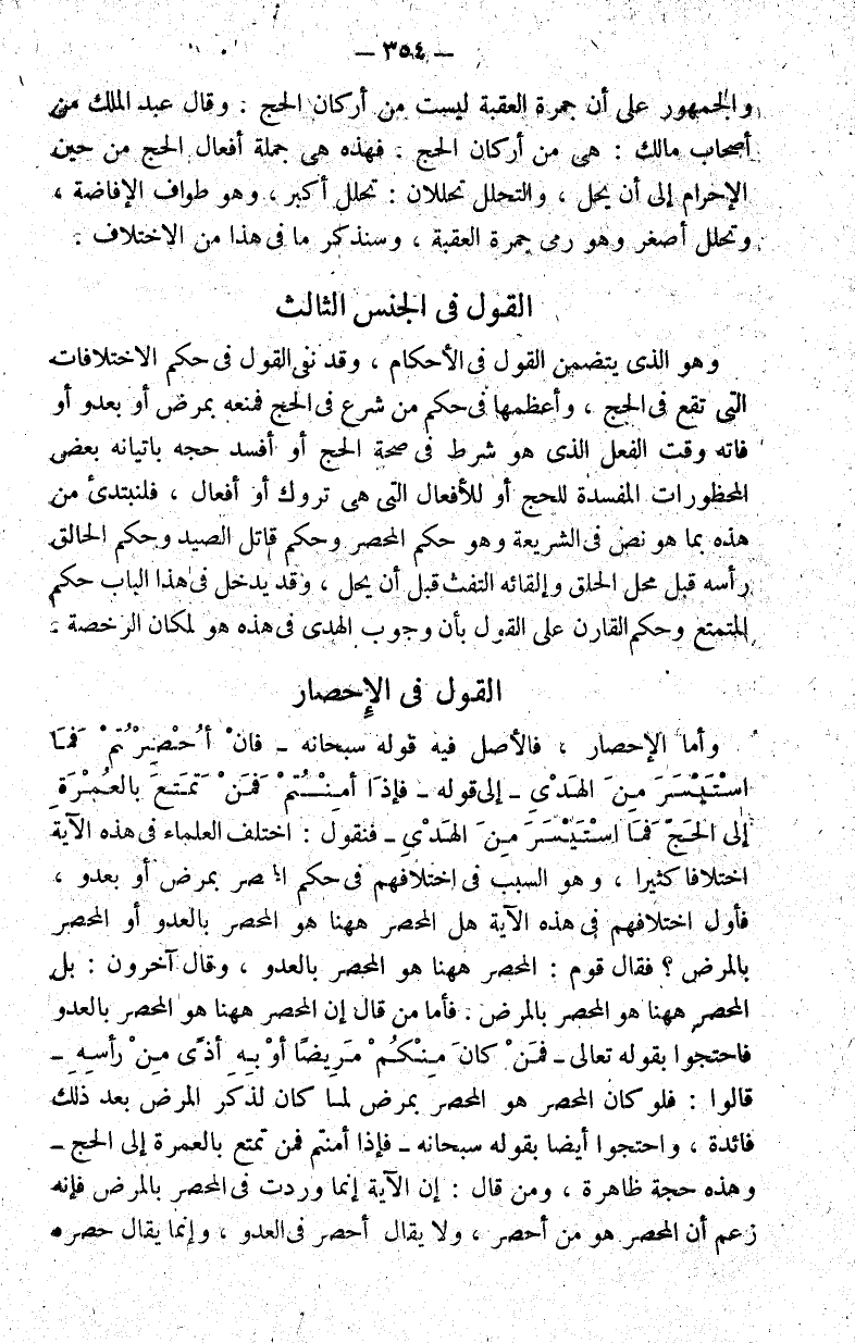 وأما الإحصار فالأصل فيه قوله سبحانه: {فَإِنْ أُحْصِرْتُمْ فَمَا اسْتَيْسَرَ مِنَ الْهَدْيِ} إلى قوله: {فَإِذَا أَمِنْتُمْ فَمَنْ تَمَتَّعَ بِالْعُمْرَةِ إِلَى الْحَجِّ فَمَا اسْتَيْسَرَ مِنَ الْهَدْيِ} فنقول: اختلف العلماء في هذه الآية اختلافا كثيرا وهو السبب في اختلافهم في حكم المحصر بمرض أو بعدو فأول اختلافهم في هذه الآية هل المحصر هاهنا هو المحصر بالعدو أو المحصر بالمرض؟ فقال قوم: المحصر هاهنا هو المحصر بالعدو وقال آخرون: بل المحصر هاهنا هو المحصر بالمرض. فأما من قال إن المحصر هاهنا هو المحصر بالعدو فاحتجوا بقوله تعالى: {فَمَنْ كَانَ مِنْكُمْ مَرِيضاً أَوْ بِهِ أَذىً مِنْ رَأْسِهِ} قالوا: فلو كان المحصر هو المحصر بمرض لما كان لذكر المرض بعد ذلك فائدة واحتجوا أيضا بقوله سبحانه: {فَإِذَا أَمِنْتُمْ فَمَنْ تَمَتَّعَ بِالْعُمْرَةِ إِلَى الْحَجِّ} وهذه حجة ظاهرة ومن قال: إن الآية إنما وردت في المحصر بالمرض فإنه زعم أن المحصر هو من أحصر ولا يقال أحصر في العدو وإنما يقال حصره