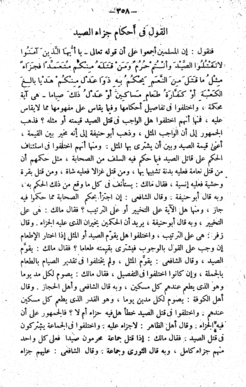 فنقول إن المسلمين أجمعوا على أن قوله تعالى: {يَا أَيُّهَا الَّذِينَ آمَنُوا لا تَقْتُلُوا الصَّيْدَ وَأَنْتُمْ حُرُمٌ وَمَنْ قَتَلَهُ مِنْكُمْ مُتَعَمِّداً فَجَزَاءٌ مِثْلُ مَا قَتَلَ مِنَ النَّعَمِ يَحْكُمُ بِهِ ذَوَا عَدْلٍ مِنْكُمْ هَدْياً بَالِغَ الْكَعْبَةِ أَوْ كَفَّارَةٌ طَعَامُ مَسَاكِينَ أَوْ عَدْلُ ذَلِكَ صِيَاماً} هي آية محكمة واختلفوا في تفاصيل أحكامها وفيما يقاس على مفهومها مما لا يقاس عليه فمنها أنهم اختلفوا هل الواجب في قتل الصيد قيمته أو مثله؟ فذهب الجمهور إلى أن الواجب المثل وذهب أبو حنيفة إلى أنه مخير بين القيمة أعني قيمة الصيد وبين أن يشتري بها المثل. ومنها أنهم اختلفوا في استئناف الحكم على قاتل الصيد فيما حكم فيه السلف من الصحابة مثل حكمهم أن من قتل نعامة فعليه بدنة تشبيها بها ومن قتل غزالا فعليه شاة ومن قتل بقرة وحشية فعليه إنسية فقال مالك: يستأنف في كل ما وقع من ذلك الحكم به وبه قال أبو حنيفة. وقال الشافعي: إن اجتزأ بحكم الصحابة مما حكموا فيه جاز ومنها هل الآية على التخيير أو على الترتيب؟ فقال مالك: هي على التخيير وبه قال أبو حنيفة يريد أن الحكمين يخيران الذي عليه الجزاء. وقال زفر: هي على الترتيب واختلفوا هل يقوم الصيد أو المثل إذا اختار الإطعام إن وجب على القول بالوجوب فيشتري بقيمته طعاما؟ فقال مالك: يقوم الصيد وقال الشافعي: يقوم المثل ولم يختلفوا في تقدير الصيام بالطعام بالجملة وإن كانوا اختلفوا في التفصيل فقال مالك: يصوم لكل مد يوما وهو الذي يطعم عندهم كل مسكين وبه قال الشافعي وأهل الحجاز. وقال أهل الكوفة: يصوم لكل مدين يوما وهو القدر الذي يطعم كل مسكين عندهم .واختلفوا في قتل الصيد خطأ هل فيه جزاء أم لا؟ فالجمهور على أن فيه الجزاء. وقال أهل الظاهر: لا جزاء عليه. واختلفوا في الجماعة يشتركون في قتل الصيد. فقال مالك: إذا قتل جماعة محرمون صيدا فعلى كل واحد منهم جزاء كامل. وبه قال الثوري وجماعة. وقال الشافعي: عليهم جزاء