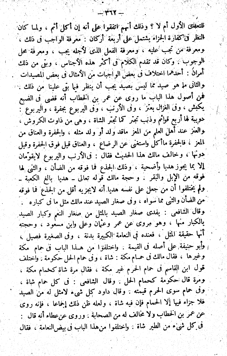 للتعدي الأول أم لا؟ وذلك أنهم اتفقوا على أنه إن أكل أثم ولما كان النظر في كفارة الجزاء يشتمل على أربعة أركان: معرفة الواجب في ذلك ومعرفة من تجب عليه ومعرفة الفعل الذي لأجله يجب ومعرفة محل الوجوب. وكان قد تقدم الكلام في أكثر هذه الأجناس وبقي من ذلك أمران: أحدهما اختلاف في بعض الواجبات من الأمثال في بعض المصيدات والثاني ما هو صيد مما ليس بصيد يجب أن ينظر فيما بقي علينا من ذلك. فمن أصول هذا الباب ما روي عن عمر بن الخطاب أنه قضى في الضبع بكبش وفي الغزال بعنز وفي الأرنب وفي اليربوع بجفرة واليربوع: دويبة لها أربع قوائم وذنب تجتر كما تجتر الشاة وهي من ذوات الكروش والعنز عند أهل العلم من المعز ما قد ولد أو لد مثله والجفرة والعناق من المعز فالجفرة ما أكل واستغنى عن الرضاع والعناق قيل فوق الجفرة وقيل دونها وخالف مالك هذا الحديث فقال: في الأرنب واليربوع لا يقومان إلا بما يجوز هديا وأضحية وذلك الجذع فما فوقه من الضأن والثني لها فوقه من الإبل والبقر. وحجة مالك قوله تعالى: {هَدْياً بَالِغَ الْكَعْبَةِ} ولم يختلفوا أن من جعل على نفسه هديا أنه لا يجزيه أقل من الجذع فما فوقه من الضأن والثني مما سواه وفي صغار الصيد عند مالك مثل ما في كباره. وقال الشافعي: يفدى صغار الصيد بالمثل من صغار النعم وكبار الصيد بالكبار منها وهو مروي عن عمر وعثمان وعلي وابن مسعود وحجته أنها حقيقة المثل فعنده في النعامة الكبيرة بدنة وفي الصغيرة فصيل وأبو حنيفة على أصله في القيمة. واختلفوا من هذا الباب في حمام مكة وغيرها فقال مالك في حمام مكة: شاة وفي حمام الحل حكومة. واختلف قول ابن القاسم في حمام الحرم غير مكة فقال مرة شاة كحمام مكة ومرة قال حكومة كحمام الحل. وقال الشافعي: في كل حمام شاة وفي حمام سوى الحرم قيمته. وقال داود كل شيء لا مثل له من الصيد فلا جزاء فيها إلا الحمام فإن فيه شاة ولعله ظن ذلك إجماعا فإنه روى عن عمر بن الخطاب ولا مخالف له من الصحابة وروي عن عطاء أنه قال: في كل شيء من الطير شاة. واختلفوا من هذا الباب في بيض النعامة فقال