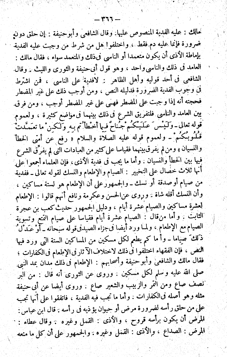 مالك: عليه الفدية المنصوص عليها. وقال الشافعي وأبو حنيفة: إن حلق دون ضرورة فإنما عليه دم فقط واختلفوا هل من شرط من وجبت عليه الفدية بإماطة الأذى أن يكون متعمدا أو الناسي في ذلك والمتعمد سواء فقال مالك: العامد في ذلك والناسي واحد وهو قول أبي حنيفة والثوري والليث. وقال الشافعي في أحد قوليه وأهل الظاهر: لا فدية على الناسي فمن اشترط في وجوب الفدية الضرورة فدليله النص ومن أوجب ذلك على غير المضطر فحجته أنه إذا وجبت على المضطر فهي على غير المضطر أوجب ومن فرق بين العامد والناسي فلتفريق الشرع في ذلك بينهما في مواضع كثيرة ولعموم قوله تعالى: {وَلَيْسَ عَلَيْكُمْ جُنَاحٌ فِيمَا أَخْطَأْتُمْ بِهِ وَلَكِنْ مَا تَعَمَّدَتْ قُلُوبُكُمْ} ولعموم قوله عليه الصلاة والسلام: "رفع عن أمتي الخطأ والنسيان" ومن لم يفرق بينهما فقياسا على كثير من العبادات التي لم يفرق الشرع فيها بين الخطأ والنسيان. وأما ما يجب في فدية الأذى فإن العلماء أجمعوا على أنها ثلاث خصال على التخيير: الصيام والإطعام والنسك لقوله تعالى: {فَفِدْيَةٌ مِنْ صِيَامٍ أَوْ صَدَقَةٍ أَوْ نُسُكٍ} والجمهور على أن الإطعام هو لستة مساكين وأن النسك أقله شاة. وروي عن الحسن وعكرمة ونافع أنهم قالوا: الإطعام لعشرة مساكين والصيام عشرة أيام ودليل الجمهور حديث كعب بن عجرة الثابت. وأما من قال: الصيام عشرة أيام فقياسا على صيام التمتع وتسوية الصيام مع الإطعام ولما ورد أيضا في جزاء الصيد في قوله سبحانه: {أَوْ عَدْلُ ذَلِكَ صِيَاماً} وأما كم يطعم لكل مسكين من المساكين الستة التي ورد فيها النص فإن الفقهاء اختلفوا في ذلك لاختلاف الآثار في الإطعام في الكفارات فقال مالك والشافعي وأبو حنيفة وأصحابهم: الإطعام في ذلك مدان بمد النبي صلى الله عليه وسلم لكل مسكين. وروي عن الثوري أنه قال: من البر نصف صاع ومن التمر والزبيب صاع. وروي أيضا عن أبي حنيفة مثله وهو أصله في الكفارات. وأما ما تجب فيه الفدية فاتفقوا على أنها تجب على من حلق رأسه لضرورة مرض أو حيوان يؤذيه في رأسه. قال ابن عباس: المرض أن يكون برأسه قروح والأذى: القمل وغيره. وقال عطاء: المرض الصداع والأذى: القمل وغيره. والجمهور على أن كل ما منعه