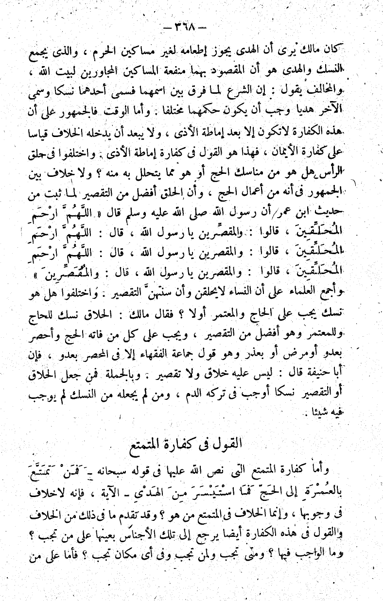 وأما كفارة المتمتع التي نص الله عليها في قوله سبحانه: {فَمَنْ تَمَتَّعَ بِالْعُمْرَةِ إِلَى الْحَجِّ فَمَا اسْتَيْسَرَ مِنَ الْهَدْيِ} الآية فإنه لا خلاف في وجوبها وإنما الخلاف في المتمتع؟ من هو وقد تقدم ما في ذلك من الخلاف والقول في هذه الكفارة أيضا يرجع إلى تلك الأجناس بعينها على من تجب؟ وما الواجب فيها؟ ومتى تجب ولمن تجب وفي أي مكان تجب؟ فأما على من