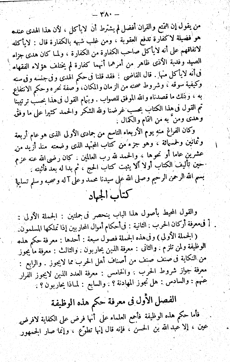 وفي هذه الجملة فصول سبعة: أحدها: معرفة حكم هذه الوظيفة ولمن تلزم. والثاني: معرفة الذين يحاربون. والثالث: معرفة ما يجوز من النكاية في صنف صنف من أصناف أهل الحرب مما لا يجوز. والرابع: معرفة جواز شروط الحرب. والخامس: معرفة العدد الذين لا يجوز الفرار عنهم. والسادس: هل تجوز المهادنة؟. والسابع: لماذا يحاربون؟.