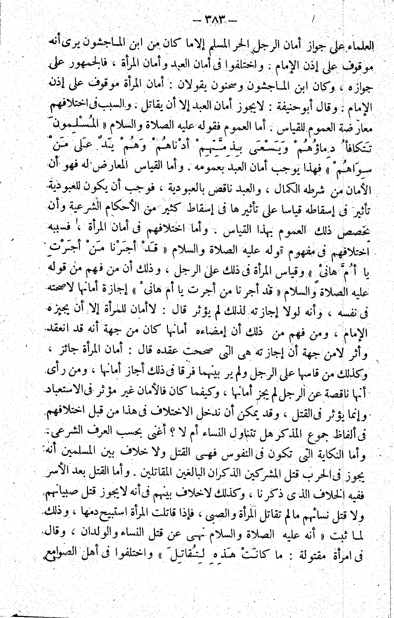 العلماء على جواز أمان الرجل الحر المسلم إلا ما كان من ابن الماجشون يرى أنه موقوف على إذن الإمام. واختلفوا في أمان العبد وأمان المرأة فالجمهور على جوازه وكان ابن الماجشون وسحنون يقولان: أمان المرأة موقوف على إذن الإمام وقال أبو حنيفة: لا يجوز أمان العبد إلا أن يقاتل. والسبب في اختلافهم معارضة العموم للقياس. أما العموم فقوله عليه الصلاة والسلام: "المسلمون تتكافأ دماؤهم ويسعى بذمتهم أدناهم وهم يد على من سواهم" فهذا يوجب أمان العبد بعمومه. وأما القياس المعارض له فهو أن اختلفا من شرطه الكمال والعبد ناقص بالعبودية فوجب أن يكون للعبودية تأثير في إسقاطه قياسا على تأثيرها في إسقاط كثير من الأحكام الشرعية وأن يخصص ذلك العموم بهذا القياس. وأما اختلافهم في أمان المرأة فسببه اختلافهم في مفهوم قوله عليه الصلاة والسلام: "قد أجرنا من أجرت يا أم هانئ" وقياس المرأة في ذلك على الرجل وذلك أن من فهم من قوله عليه الصلاة والسلام: "قد أجرنا من أجرت يا أم هانئ" إجازة أمانها لا صحته في نفسه وأنه لولا إجازته لذلك لم يؤثر قال: لا أمان للمرأة إلا أن يجيزه الإمام ومن فهم من ذلك أن إمضاءه أمانها كان من جهة أنه قد انعقد وأثر لا من جهة أن إجازته هي التي صححت عقده قال: أمان المرأة جائز وكذلك من قاسها على الرجل ولم ير بينهما فرقا في ذلك أجاز أمانها ومن رأى أنها ناقصة عن الرجل لم يجز أمانها وكيفما كان فالأمان غير مؤثر في الاستعباد وإنما يؤثر في القتل وقد يمكن أن ندخل الاختلاف في هذا من قبل اختلافهم في ألفاظ جموع المذكر هل تتناول النساء أم لا؟ أعني بحسب العرف الشرعي. وأما النكاية التي تكون في النفوس فهي القتل ولا خلاف بين المسلمين أنه يجوز في الحرب قتل المشركين الذكران البالغين المقاتلين. وأما القتل بعد الأسر ففيه الخلاف الذي ذكرنا وكذلك لا خلاف بينهم في أنه لا يجوز قتل صبيانهم ولا قتل نسائهم ما لم تقاتل المرأة والصبي فإذا قاتلت المرأة استبيح دمها وذلك لما ثبت أنه عليه الصلاة والسلام نهى عن قتل النساء والولدان وقال في امرأة مقتولة: "ما كانت هذه لتقاتل" واختلفوا في أهل الصوامع