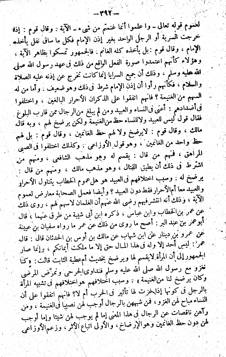 لعموم قوله تعالى: {وَاعْلَمُوا أَنَّمَا غَنِمْتُمْ مِنْ شَيْءٍ} الآية. وقال قوم: إذا خرجت السرية أو الرجل الواحد بغير إذن الإمام فكل ما ساق العربي يأخذه الإمام وقال قوم: بل يأخذه كله الغانم. فالجمهور تمسكوا بظاهر الآية وهؤلاء كأنهم اعتمدوا صورة الفعل الواقع من ذلك في عهد رسول الله صلى الله عليه وسلم وذلك أن جميع السرايا إنما كانت تخرج عن إذنه عليه الصلاة والسلام فكأنهم رأوا أن إذن الإمام شرط في ذلك وهو ضعيف. وأما من له السهم من الغنيمة؟ فإنهم اتفقوا على الذكران الأحرار البالغين واختلفوا في أضدادهم: أعني في النساء والعبيد ومن لم يبلغ من الرجال ممن قارب البلوغ فقال قوم ليس للعبيد ولا للنساء حظ من الغنيمة ولكن يرضخ لهم وبه قال مالك وقال قوم: لا يرضخ ولا لهم حظ الغانمين وقال قوم: بل لهم حظ واحد من الغانمين وهو قول الأوزاعي. وكذلك اختلفوا في الصبي المراهق فمنهم من قال: يقسم له وهو مذهب الشافعي ومنهم من اشترط في ذلك أن يطيق القتال وهو مذهب مالك ومنهم من قال: يرضخ له. وسبب اختلافهم في العبيد هو هل عموم الخطاب يتناول الأحرار والعبيد معا أم الأحرار فقط دون العبيد؟ وأيضا فعمل الصحابة معارض لعموم الآية وذلك أنه انتشر فيهم رضي الله عنهم أن الغلمان لا سهم لهم وروي ذلك عن عمر بن الخطاب وابن عباس ذكره ابن أبي شيبة من طرق عنهما قال أبو عمر بن عبد البر: أصح ما روي من ذلك عن عمر ما رواه سفيان بن عيينة عن عمرو بن دينار عن ابن شهاب عن مالك بن أوس بن الحدثان قال: قال عمر: ليس أحد إلا وله في هذا المال حق إلا ما ملكت أيمانكم وإنما صار الجمهور إلى أن المرأة لا يقسم بها ويرضخ بحديث أم عطية الثابت قالت: كنا نغزو مع رسول الله صلى الله عليه وسلم فنداوي الجرحى ونمرض المرضى وكان يرضخ لنا من الغنيمة. وسبب اختلافهم هو اختلافهم في تشبيه المرأة بالرجل في كونها إذا عزت لها تأثير في الحرب أم لا؟ فإنهم اتفقوا على أن النساء مباح لهن الغزو فمن شبههن بالرجال أوجب لهن نصيبا في الغنيمة ومن رآهن ناقصات عن الرجال في هذا المعنى إما لم يوجب لهم شيئا وإما أوجب لهم دون حظ الغانمين وهو الأرضاخ والأولى اتباع الأثر وزعم الأوزاعي