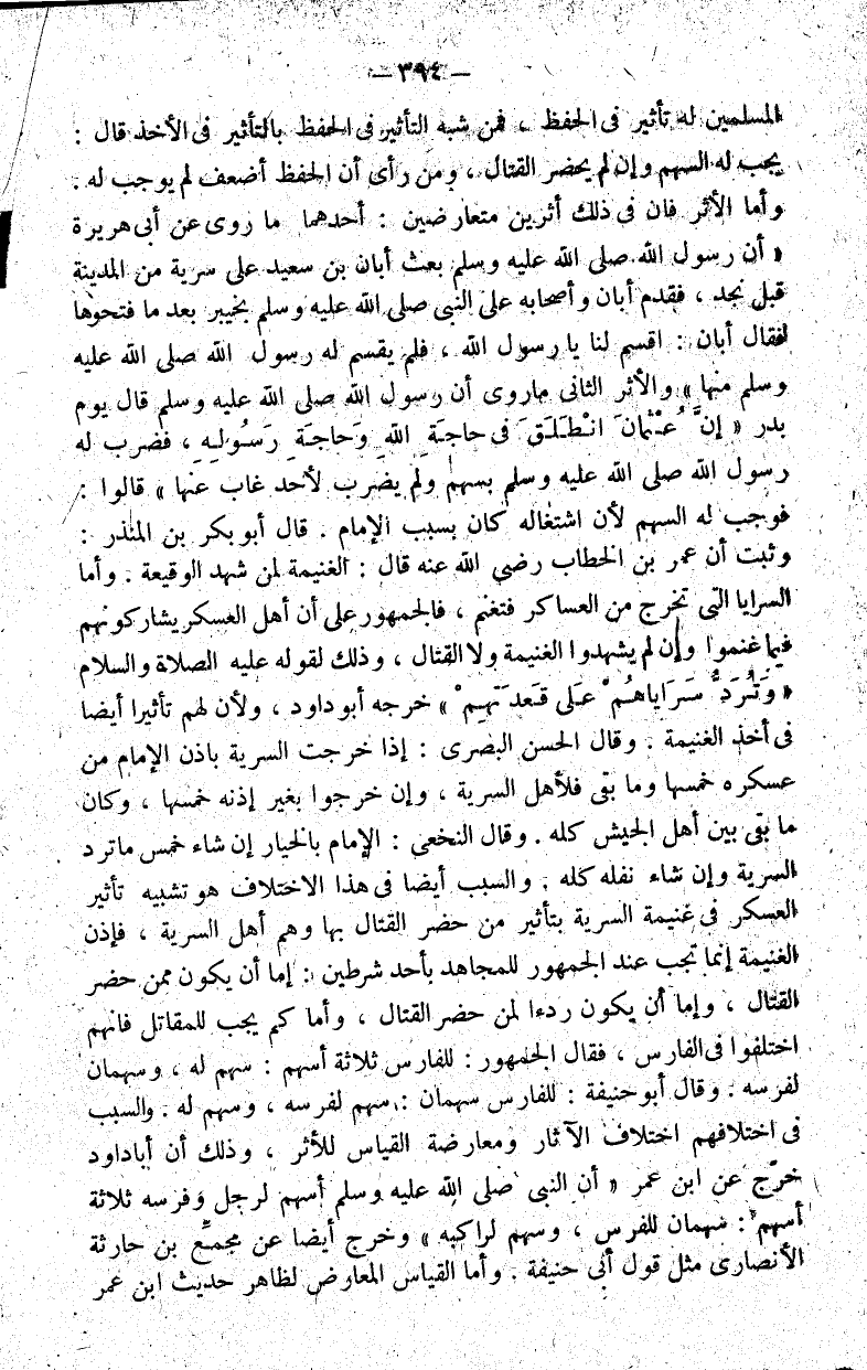 المسلمين له تأثير في الحفظ فمن شبه التأثير في الأخذ قال: يجب له السهم وإن لم يحضر القتال ومن رأى أن الحفظ أضعف لم يوجب له. وأما الأثر فإن في ذلك أثرين متعارضين: أحدهما ما روي عن أبي هريرة أن رسول الله صلى الله عليه وسلم بعث أبان بن سعيد على سرية من المدينة قبل نجد فقدم أبان وأصحابه على النبي صلى الله عليه وسلم بخيبر بعدما فتحوها فقال أبان: اقسم لنا يا رسول الله فلم يقسم له رسول الله صلى الله عليه وسلم منها والأثر الثاني ما روي أن رسول الله صلى الله عليه وسلم قال يوم بدر: "إن عثمان انطلق في حاجة الله وحاجة رسوله" فضرب له رسول الله صلى الله عليه وسلم بسهم ولم يضرب لأحد غاب عنها قالوا: فوجب له السهم لأن اشتغاله كان بسبب الإمام. قال أبو بكر بن المنذر: وثبت أن عمر بن الخطاب رضي الله عنه قال: الغنيمة لمن شهد الوقيعة. وأما السرايا التي تخرج من العساكر فتغنم فالجمهور على أن أهل العسكر يشاركونهم فيما غنموا وإن لم يشهدوا الغنيمة ولا القتال وذلك لقوله عليه الصلاة والسلام: "وترد سراياهم على قعدتهم" خرجه أبو داود ولأن لهم تأثيرا أيضا في أخذ الغنيمة. وقال الحسن البصري: إذا خرجت السرية بإذن الإمام من عسكره خمسها وما بقي فلأهل السرية وإن خرجوا بغير إذنه خمسها وكان ما بقي بين أهل الجيش كله. وقال النخعي: الإمام بالخيار إن شاء خمس ما ترد السرية وإن شاء نفله كله. والسبب أيضا في هذا الاختلاف هو تشبيه تأثير العسكر في غنيمة السرية بتأثير من حضر القتال بها وهم أهل السرية فإذن الغنيمة إنما تجب عند الجمهور للمجاهد بأحد شرطين: إما أن يكون ممن حضر القتال وإما أن يكون ردءا لمن حضر القتال وأما كم يجب للمقاتل فإنهم اختلفوا في الفارس فقال الجمهور: للفارس ثلاثة أسهم: سهم له وسهمان لفرسه. وقال أبو حنيفة: للفارس سهمان: سهم لفرسه وسهم له. والسبب في اختلافهم اختلاف الآثار ومعارضة القياس للأثر وذلك أن أبا داود خرج عن ابن عمر أن النبي صلى الله عليه وسلم أسهم لرجل وفرسه ثلاثة أسهم: سهمان للفرس وسهم لراكبه وخرج أيضا عن مجمع بن حارثة الأنصاري مثل قول أبي حنيفة. وأما القياس المعارض لظاهر حديث ابن عمر