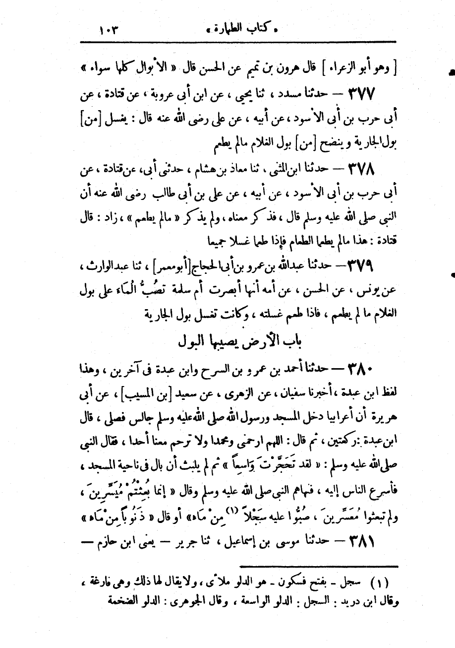 380 - حَدَّثَنَا أَحْمَدُ بْنُ عَمْرِو بْنِ السَّرْحِ، وَابْنُ عَبْدَةَ فِي آخَرِينَ - وَهَذَا لَفْظُ ابْنِ عَبْدَة - أَخْبَرَنَا سُفْيَانُ، عَنِ الزُّهْرِيِّ، عَنْ سَعِيدِ بْنِ الْمُسَيِّبِ، عَنْ أَبِي هُرَيْرَةِ، أَنَّ أَعْرَابِيًّا دَخَلَ الْمَسْجِدَ وَرَسُولُ اللَّهِ صَلَّى اللهُ عَلَيْهِ وَسَلَّمَ جَالِسٌ فَصَلَّى قَالَ ابْنُ عَبْدَة: رَكْعَتَيْنِ، ثُمَّ قَالَ: اللَّهُمَّ ارْحَمْنِي وَمُحَمَّدًا، وَلَا تَرْحَمْ مَعَنَا أَحَدًا، فَقَالَ النَّبِيُّ صَلَّى اللهُ عَلَيْهِ وَسَلَّمَ: «لَقَدْ تَحَجَّرْتَ وَاسِعًا». ثُمَّ لَمْ يَلْبَثْ أَنْ بَالَ فِي نَاحِيَةِ الْمَسْجِدِ فَأَسْرَعَ النَّاسُ إِلَيْهِ، فَنَهَاهُمُ النَّبِيُّ صَلَّى اللهُ عَلَيْهِ وَسَلَّمَ وَقَالَ: «إِنَّمَا بُعِثْتُمْ مُيَسِّرِينَ، وَلَمْ تُبْعَثُوا مُعَسِّرِينَ، §صُبُّوا عَلَيْهِ سَجْلًا مِنْ مَاءٍ» أَوْ قَالَ: «ذَنُوبًا مِنْ مَاءٍ».