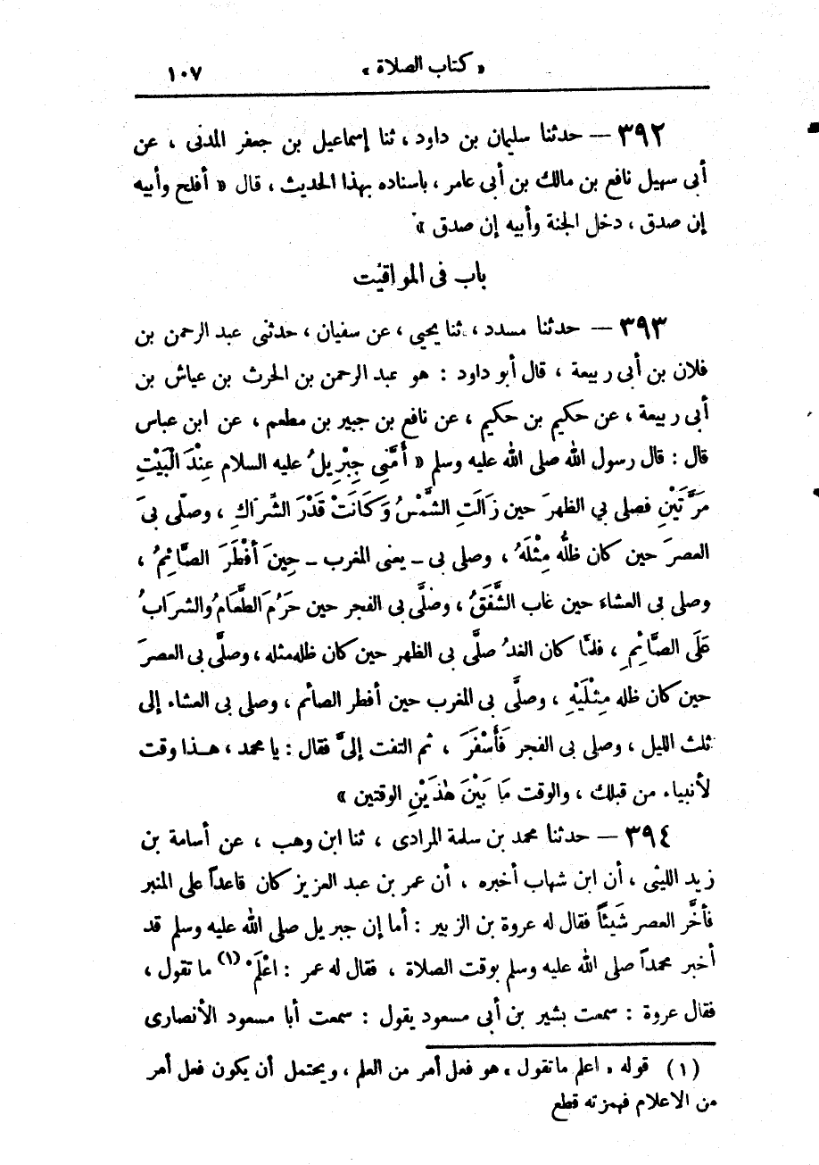 394 - حَدَّثَنَا مُحَمَّدُ بْنُ سَلَمَةَ الْمُرَادِيُّ، حَدَّثَنَا ابْنُ وَهْبٍ، عَنْ أُسَامَةَ بْنِ زَيْدٍ اللَّيْثِيِّ، أَنَّ ابْنَ شِهَابٍ، أَخْبَرَهُ، أَنّ عُمَرَ بْنَ عَبْدِ الْعَزِيزِ كَانَ قَاعِدًا عَلَى الْمِنْبَرِ فَأَخَّرَ الْعَصْرَ شَيْئًا، فَقَالَ لَهُ: عُرْوَةُ بْنُ الزُّبَيْر أَمَا إِنَّ جِبْرِيلَ صَلَّى اللهُ عَلَيْهِ وَسَلَّمَ قَدْ أَخْبَرَ مُحَمَّدًا صَلَّى اللهُ عَلَيْهِ وَسَلَّمَ بِوَقْتِ الصَّلَاةِ، فَقَالَ لَهُ عُمَر: اعْلَمْ مَا تَقُولُ: فَقَالَ: عُرْوَةُ سَمِعْتُ بَشِيرَ بْنَ أَبِي مَسْعُودٍ يَقُولُ: سَمِعْتُ أَبَا مَسْعُودٍ الْأَنْصَارِيَّ -[108]- يَقُولُ: سَمِعْتُ رَسُولَ اللَّهِ صَلَّى اللهُ عَلَيْهِ وَسَلَّمَ يَقُولُ: «نَزَلَ جِبْرِيلُ صَلَّى اللهُ عَلَيْهِ وَسَلَّمَ فَأَخْبَرَنِي بِوَقْتِ الصَّلَاةِ §فَصَلَّيْتُ مَعَهُ، ثُمَّ صَلَّيْتُ مَعَهُ، ثُمَّ صَلَّيْتُ مَعَهُ، ثُمَّ صَلَّيْتُ مَعَهُ، ثُمَّ صَلَّيْتُ مَعَهُ» يَحْسُبُ بِأَصَابِعِهِ خَمْسَ صَلَوَاتٍ. «فَرَأَيْتُ رَسُولَ اللَّهِ صَلَّى اللهُ عَلَيْهِ وَسَلَّمَ صَلَّى الظُّهْرَ حِينَ تَزُولُ الشَّمْسُ، وَرُبَّمَا أَخَّرَهَا حِينَ يَشْتَدُّ الْحَرُّ، وَرَأَيْتُهُ يُصَلِّي الْعَصْرَ وَالشَّمْسُ مُرْتَفِعَةٌ بَيْضَاءُ قَبْلَ أَنْ تَدْخُلَهَا الصُّفْرَةُ، فَيَنْصَرِفُ الرَّجُلُ مِنَ الصَّلَاةِ، فَيَأْتِي ذَا الْحُلَيْفَةِ قَبْلَ غُرُوبِ الشَّمْسِ، وَيُصَلِّي الْمَغْرِبَ حِينَ تَسْقُطُ الشَّمْسُ، وَيُصَلِّي الْعِشَاءَ حِينَ يَسْوَدُّ الْأُفُقُ، وَرُبَّمَا أَخَّرَهَا حَتَّى يَجْتَمِعَ النَّاسُ، وَصَلَّى الصُّبْحَ مَرَّةً بِغَلَسٍ، ثُمَّ صَلَّى مَرَّةً أُخْرَى فَأَسْفَرَ بِهَا، ثُمَّ كَانَتْ صَلَاتُهُ بَعْدَ ذَلِكَ التَّغْلِيسَ حَتَّى مَاتَ، وَلَمْ يَعُدْ إِلَى أَنْ يُسْفِرَ» قَالَ أَبُو دَاوُدَ: رَوَى هَذَا الْحَدِيثَ عَنِ الزُّهْرِيِّ، مَعْمَرٌ وَمَالِكٌ، وَابْنُ عُيَيْنَةَ وَشُعَيْبُ بْنُ أَبِي حَمْزَةَ وَاللَّيْثُ بْنُ سَعْدٍ وَغَيْرُهُمْ لَمْ يَذْكُرُوا الْوَقْتَ الَّذِي صَلَّى فِيهِ وَلَمْ يُفَسِّرُوهُ، وَكَذَلِكَ أَيْضًا رَوَى هِشَامُ بْنُ عُرْوَةَ وَحَبِيبُ بْنُ أَبِي مَرْزُوقٍ، عَنْ عُرْوَةَ نَحْوَ رِوَايَةِ مَعْمَرٍ وَأَصْحَابِهِ إِلَّا أَنَّ حَبِيبًا لَمْ يَذْكُرْ بَشِيرًا، وَرَوَى وَهْبُ بْنُ كَيْسَانَ، عَنْ جَابِرٍ، عَنِ النَّبِيِّ صَلَّى اللهُ عَلَيْهِ وَسَلَّمَ وَقْتَ الْمَغْرِبِ قَالَ: «ثُمَّ جَاءَهُ لِلْمَغْرِبِ حِينَ غَابَتِ الشَّمْسُ يَعْنِي مِنَ الْغَدِ وَقْتًا وَاحِدًا». وَكَذَلِكَ رُوِيَ عَنْ أَبِي هُرَيْرَةَ، عَنِ النَّبِيِّ صَلَّى اللهُ عَلَيْهِ وَسَلَّمَ قَالَ: «ثُمَّ صَلَّى بِيَ الْمَغْرِبَ». يَعْنِي مِنَ الْغَدِ وَقْتًا وَاحِدًا، وَكَذَلِكَ رُوِيَ عَنْ عَبْدِ اللَّهِ بْنِ عَمْرِو بْنِ الْعَاص مِنْ حَدِيثِ حَسَّانَ بْنِ عَطِيَّةَ، عَنْ عَمْرِو بْنِ شُعَيْبٍ، عَنْ أَبِيهِ عَنْ جَدِّه عَنِ النَّبِيِّ صَلَّى اللهُ عَلَيْهِ وَسَلَّمَ
