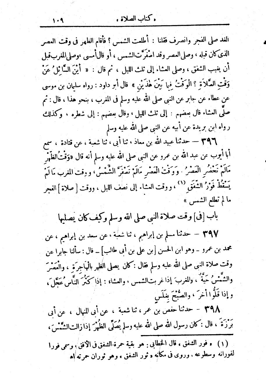 397 - حَدَّثَنَا مُسْلِمُ بْنُ إِبْرَاهِيمَ، حَدَّثَنَا شُعْبَةُ، عَنْ سَعْدِ بْنِ إِبْرَاهِيمَ، عَنْ مُحَمَّدِ بْنِ عَمْرٍو وَهُوَ ابْنُ الْحَسَنِ بْنِ عَلِيِّ بْنِ أَبِي طَالِبٍ قَالَ: سَأَلْنَا جَابِرًا عَنْ وَقْتِ صَلَاةِ النَّبِيِّ صَلَّى اللهُ عَلَيْهِ وَسَلَّمَ فَقَالَ: «كَانَ §يُصَلِّي الظُّهْرَ بِالْهَاجِرَةِ، وَالْعَصْرَ وَالشَّمْسُ حَيَّةٌ، وَالْمَغْرِبَ إِذَا غَرَبَتِ الشَّمْسُ، وَالْعِشَاءَ إِذَا كَثُرَ النَّاسُ عَجَّلَ، وَإِذَا قَلُّوا أَخَّرَ، وَالصُّبْحَ بِغَلَسٍ»
