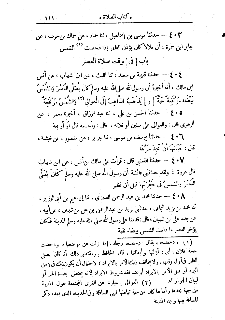 404 - حَدَّثَنَا قُتَيْبَةُ بْنُ سَعِيدٍ، حَدَّثَنَا اللَّيْثُ، عَنِ ابْنِ شِهَابٍ، عَنْ أَنَسِ بْنِ مَالِكٍ أَنَّهُ أَخْبَرَهُ، «أَنَّ رَسُولَ اللَّهِ صَلَّى اللهُ عَلَيْهِ وَسَلَّمَ كَانَ §يُصَلِّي الْعَصْرَ وَالشَّمْسُ بَيْضَاءُ مُرْتَفِعَةٌ حَيَّةٌ» وَيَذْهَبُ الذَّاهِبُ إِلَى الْعَوَالِي وَالشَّمْسُ مُرْتَفِعَةٌ