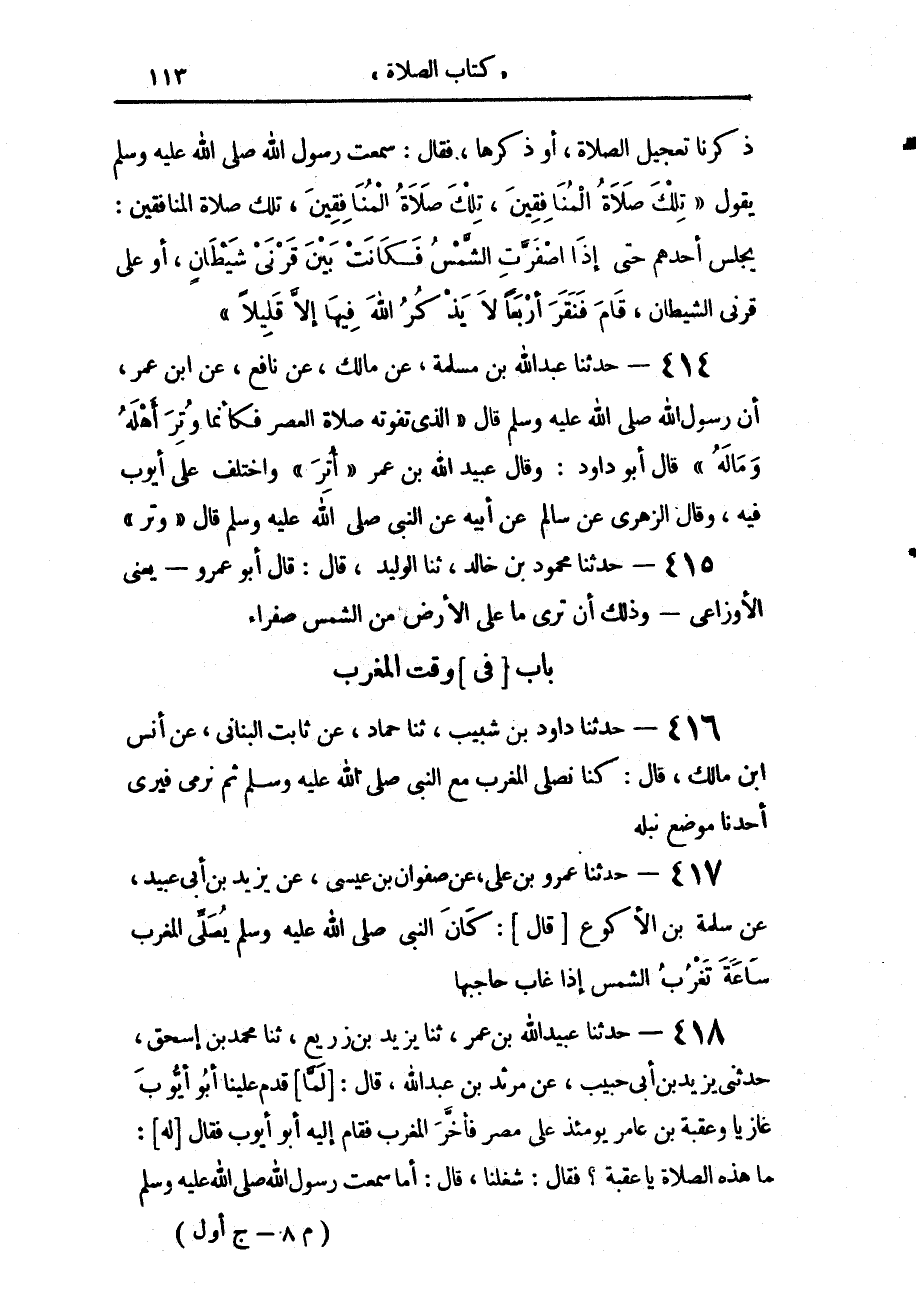 418 - حَدَّثَنَا عُبَيْدُ اللَّهِ بْنُ عُمَرَ، حَدَّثَنَا يَزِيدُ بْنُ زُرَيْعٍ، حَدَّثَنَا مُحَمَّدُ بْنُ إِسْحَاقَ، حَدَّثَنِي يَزِيدُ بْنُ أَبِي حَبِيبٍ، عَنْ مَرْثَدِ بْنِ عَبْدِ اللَّهِ، قَالَ: لَمَّا قَدِمَ عَلَيْنَا أَبُو أَيُّوبَ غَازِيًا وَعُقْبَةُ بْنُ عَامِر يَوْمَئِذٍ عَلَى مِصْرَ فَأَخَّرَ الْمَغْرِبَ فَقَامَ إِلَيْهِ أَبُو أَيُّوب، فَقَالَ: لَهُ مَا هَذِهِ الصَّلَاةُ يَا عُقْبَةُ، فَقَالَ: شُغِلْنَا، قَالَ: أَمَا سَمِعْتَ رَسُولَ اللَّهِ صَلَّى اللهُ عَلَيْهِ وَسَلَّمَ -[114]- يَقُولُ: «§لَا تَزَالُ أُمَّتِي بِخَيْرٍ» - أَوْ قَالَ: عَلَى الْفِطْرَةِ - مَا لَمْ يُؤَخِّرُوا الْمَغْرِبَ إِلَى أَنْ تَشْتَبِكَ النُّجُومُ "