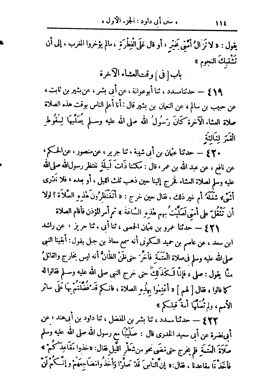 419 - حَدَّثَنَا مُسَدَّدٌ، حَدَّثَنَا أَبُو عَوَانَةَ، عَنْ أَبِي بِشْرٍ، عَنْ بَشِيرِ بْنِ ثَابِتٍ، عَنْ حَبِيبِ بْنِ سَالِمٍ، عَنِ النُّعْمَانِ بْنِ بَشِيرٍ، قَالَ: أَنَا أَعْلَمُ النَّاسِ بِوَقْتِ هَذِهِ الصَّلَاةِ «§صَلَاةِ الْعِشَاءِ الْآخِرَةِ كَانَ رَسُولُ اللَّهِ صَلَّى اللهُ عَلَيْهِ وَسَلَّمَ يُصَلِّيهَا لِسُقُوطِ الْقَمَرِ لِثَالِثَةٍ»