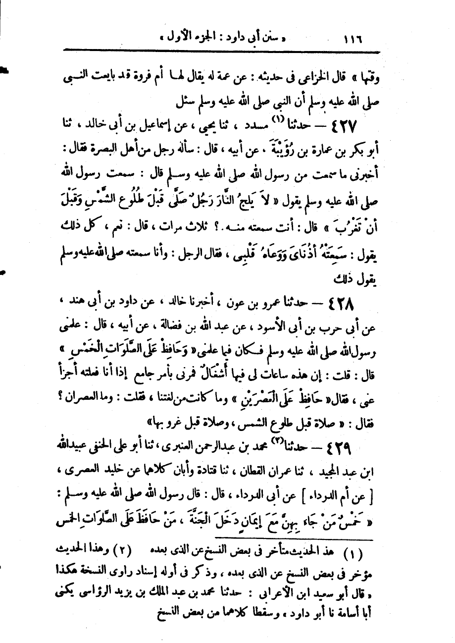427 - حَدَّثَنَا مُسَدَّدٌ، حَدَّثَنَا يَحْيَى، عَنْ إِسْمَاعِيلَ بْنِ أَبِي خَالِدٍ، حَدَّثَنَا أَبُو بَكْرِ بْنُ عُمَارَةَ بْنِ رُؤَيْبَةَ، عَنْ أَبِيهِ، قَالَ: سَأَلَهُ رَجُلٌ مِنْ أَهْلِ الْبَصْرَةِ فَقَالَ: أَخْبِرْنِي مَا سَمِعْتَ مِنْ رَسُولِ اللَّهِ صَلَّى اللهُ عَلَيْهِ وَسَلَّمَ قَالَ: سَمِعْتُ رَسُولَ اللَّهِ صَلَّى اللهُ عَلَيْهِ وَسَلَّمَ يَقُولُ: «§لَا يَلِجُ النَّارَ رَجُلٌ صَلَّى قَبْلَ طُلُوعِ الشَّمْسِ وَقَبْلَ أَنْ تَغْرُبَ»، قَالَ: أَنْتَ سَمِعْتَهُ مِنْهُ؟ ثَلَاثَ مَرَّاتٍ قَالَ: نَعَمْ، كُلُّ ذَلِكَ يَقُولُ: سَمِعَتْهُ أُذُنَايَ وَوَعَاهُ قَلْبِي، فَقَالَ الرَّجُلُ: وَأَنَا سَمِعْتُهُ صَلَّى اللهُ عَلَيْهِ وَسَلَّمَ يَقُولُ ذَلِكَ