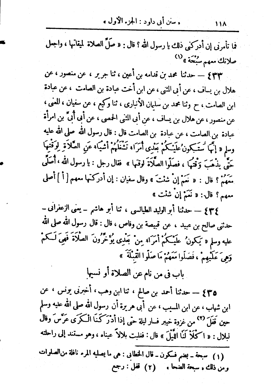 433 - حَدَّثَنَا مُحَمَّدُ بْنُ قُدَامَةَ بْنِ أَعْيَنَ، حَدَّثَنَا جَرِيرٌ، عَنْ مَنْصُورٍ، عَنْ هِلَالِ بْنِ يَسَافٍ، عَنْ أَبِي الْمُثَنَّى، عَنِ ابْنِ أُخْتِ عُبَادَةَ بْنِ الصَّامِتِ، عَنْ عُبَادَةَ بْنِ الصَّامِتِ، ح وَحَدَّثَنَا مُحَمَّدُ بْنُ سُلَيْمَانَ الْأَنْبَارِيُّ، حَدَّثَنَا وَكِيعٌ، عَنْ سُفْيَانَ الْمَعْنَى، عَنْ مَنْصُورٍ، عَنْ هِلَالِ بْنِ يَسَافٍ، عَنْ أَبِي الْمُثَنَّى الْحِمْصِيِّ، عَنْ أَبِي أُبَيٍّ ابْنِ امْرَأَةِ عُبَادَةَ بْنِ الصَّامِتِ، عَنْ عُبَادَةَ بْنِ الصَّامِتِ، قَالَ: قَالَ رَسُولُ اللَّهِ صَلَّى اللهُ عَلَيْهِ وَسَلَّمَ: «إِنَّهَا سَتَكُونُ عَلَيْكُمْ بَعْدِي أُمَرَاءُ تَشْغَلُهُمْ أَشْيَاءُ عَنِ الصَّلَاةِ لِوَقْتِهَا حَتَّى يَذْهَبَ وَقْتُهَا §فَصَلُّوا الصَّلَاةَ لِوَقْتِهَا»، فَقَالَ رَجُلٌ: يَا رَسُولَ اللَّهِ أُصَلِّي مَعَهُمْ؟، قَالَ: «نَعَمْ، إِنْ شِئْتَ» - وَقَالَ سُفْيَانُ: إِنْ أَدْرَكْتُهَا مَعَهُمْ أُصَلِّي مَعَهُمْ؟ - قَالَ: «نَعَمْ، إِنْ شِئْتَ»