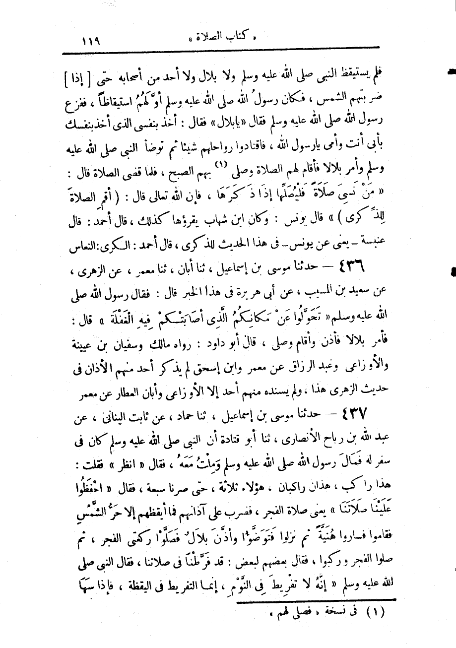 437 - حَدَّثَنَا مُوسَى بْنُ إِسْمَاعِيلَ، حَدَّثَنَا حَمَّادٌ، عَنْ ثَابِتٍ الْبُنَانِيِّ، عَنْ عَبْدِ اللَّهِ بْنِ رَبَاحٍ الْأَنْصَارِيِّ، حَدَّثَنَا أَبُو قَتَادَةَ، أَنَّ النَّبِيَّ صَلَّى اللهُ عَلَيْهِ وَسَلَّمَ كَانَ فِي سَفَرٍ لَهُ فَمَالَ رَسُولُ اللَّهِ صَلَّى اللهُ عَلَيْهِ وَسَلَّمَ وَمِلْتُ مَعَهُ، قَالَ: «انْظُرْ»، فَقُلْتُ: هَذَا رَاكِبٌ، هَذَانِ رَاكِبَانِ، هَؤُلَاءِ ثَلَاثَةٌ، حَتَّى صِرْنَا سَبْعَةً، فَقَالَ: «احْفَظُوا عَلَيْنَا صَلَاتَنَا» - يَعْنِي صَلَاةَ الْفَجْرِ - فَضُرِبَ عَلَى آذَانِهِمْ فَمَا أَيْقَظَهُمْ إِلَّا حَرُّ الشَّمْسِ فَقَامُوا فَسَارُوا هُنَيَّةً ثُمَّ نَزَلُوا فَتَوَضَّئُوا وَأَذَّنَ بِلَالٌ فَصَلَّوْا رَكْعَتَيِ الْفَجْرِ، ثُمَّ صَلَّوُا الْفَجْرَ وَرَكِبُوا، فَقَالَ بَعْضُهُمْ لِبَعْضٍ: قَدْ فَرَّطْنَا فِي صَلَاتِنَا، فَقَالَ النَّبِيُّ صَلَّى اللهُ عَلَيْهِ وَسَلَّمَ: «إِنَّهُ لَا تَفْرِيطَ فِي النَّوْمِ، إِنَّمَا التَّفْرِيطُ فِي الْيَقَظَةِ §فَإِذَا سَهَا -[120]- أَحَدُكُمْ عَنْ صَلَاةٍ فَلْيُصَلِّهَا حِينَ يَذْكُرُهَا وَمِنَ الْغَدِ لِلْوَقْتِ»