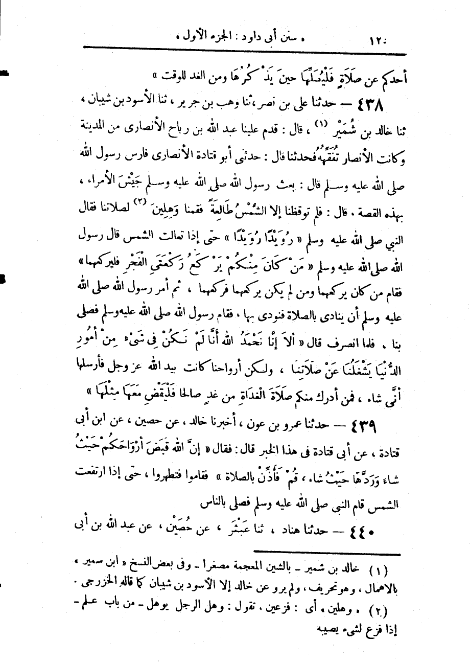 438 - حَدَّثَنَا عَلِيُّ بْنُ نَصْرٍ، حَدَّثَنَا وَهْبُ بْنُ جَرِيرٍ، حَدَّثَنَا الْأَسْوَدُ بْنُ شَيْبَانَ، حَدَّثَنَا خَالِدُ بْنُ سُمَيْرٍ، قَالَ: قَدِمَ عَلَيْنَا عَبْدُ اللَّهِ بْنُ رَبَاحٍ الْأَنْصَارِيُّ، مِنَ الْمَدِينَةِ وَكَانَتِ الْأَنْصَارُ تُفَقِّهُهُ، فَحَدَّثَنَا قَالَ: حَدَّثَنِي أَبُو قَتَادَةَ الْأَنْصَارِيُّ فَارِسُ رَسُولِ اللَّهِ صَلَّى اللهُ عَلَيْهِ وَسَلَّمَ، قَالَ: بَعَثَ رَسُولُ اللَّهِ صَلَّى اللهُ عَلَيْهِ وَسَلَّمَ جَيْشَ الْأُمَرَاءِ - بِهَذِهِ الْقِصَّةِ - قَالَ: فَلَمْ تُوقِظْنَا إِلَّا الشَّمْسُ طَالِعَةً فَقُمْنَا وَهِلِينَ لِصَلَاتِنَا فَقَالَ النَّبِيُّ صَلَّى اللهُ عَلَيْهِ وَسَلَّمَ: «رُوَيْدًا رُوَيْدًا»، حَتَّى إِذَا تَعَالَتِ الشَّمْسُ، قَالَ رَسُولُ اللَّهِ صَلَّى اللهُ عَلَيْهِ وَسَلَّمَ: «مَنْ كَانَ مِنْكُمْ يَرْكَعُ رَكْعَتَيِ الْفَجْرِ فَلْيَرْكَعْهُمَا»، فَقَامَ مَنْ كَانَ يَرْكَعُهُمَا وَمَنْ لَمْ يَكُنْ يَرْكَعُهُمَا فَرَكَعَهُمَا ثُمَّ أَمَرَ رَسُولُ اللَّهِ صَلَّى اللهُ عَلَيْهِ وَسَلَّمَ أَنْ يُنَادَى بِالصَّلَاةِ فَنُودِيَ بِهَا فَقَامَ رَسُولُ اللَّهِ صَلَّى اللهُ عَلَيْهِ وَسَلَّمَ فَصَلَّى بِنَا فَلَمَّا انْصَرَفَ قَالَ: «أَلَا إِنَّا نَحْمَدُ اللَّهَ أَنَّا §لَمْ نَكُنْ فِي شَيْءٍ مِنْ أُمُورِ الدُّنْيَا يَشْغَلُنَا عَنْ صَلَاتِنَا وَلَكِنَّ أَرْوَاحَنَا كَانَتْ بِيَدِ اللَّهِ عَزَّ وَجَلَّ فَأَرْسَلَهَا أَنَّى شَاءَ فَمَنْ أَدْرَكَ مِنْكُمْ صَلَاةَ الْغَدَاةِ مِنْ غَدٍ صَالِحًا فَلْيَقْضِ مَعَهَا مِثْلَهَا»،