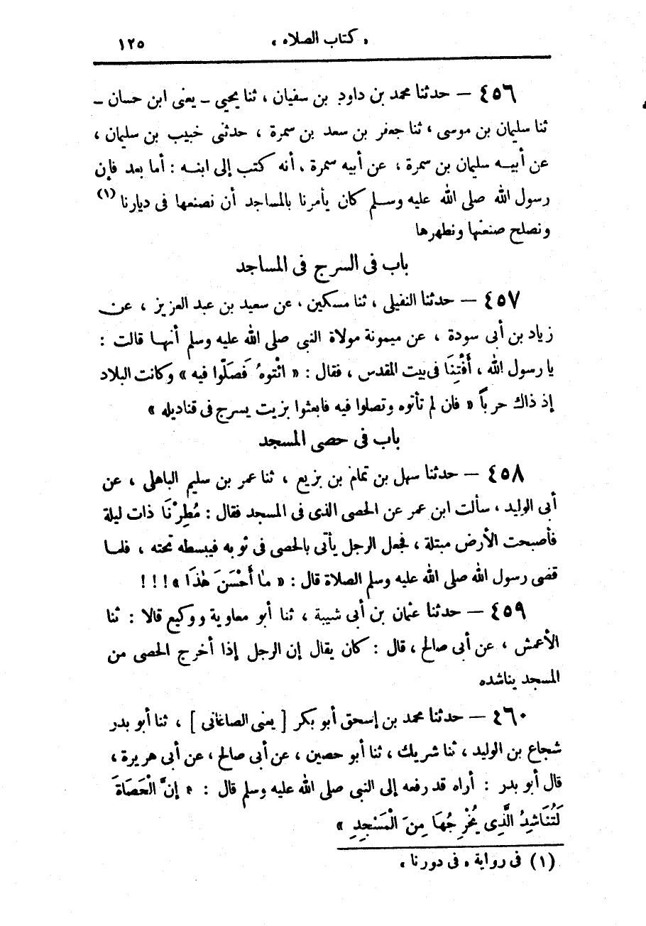 456 - حَدَّثَنَا مُحَمَّدُ بْنُ دَاوُدَ بْنِ سُفْيَانَ، حَدَّثَنَا يَحْيَى يَعْنِي ابْنَ حَسَّانَ، حَدَّثَنَا سُلَيْمَانُ بْنُ مُوسَى، حَدَّثَنَا جَعْفَرُ بْنُ سَعْدِ بْنِ سَمُرَةَ، حَدَّثَنِي خُبَيْبُ بْنُ سُلَيْمَانَ، عَنْ أَبِيهِ سُلَيْمَانَ بْنِ سَمُرَةَ، عَنْ أَبِيهِ سَمُرَةَ، أَنَّهُ كَتَبَ إِلَى ابْنِهِ: أَمَّا بَعْدُ فَإِنَّ رَسُولَ اللَّهِ صَلَّى اللهُ عَلَيْهِ وَسَلَّمَ «كَانَ §يَأْمُرُنَا بِالْمَسَاجِدِ أَنْ نَصْنَعَهَا فِي دِيَارِنَا، وَنُصْلِحَ صَنْعَتَهَا وَنُطَهِّرَهَا»