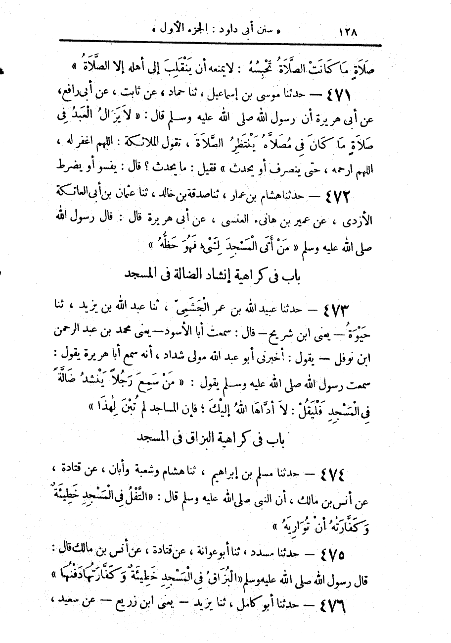 475 - حَدَّثَنَا مُسَدَّدٌ، حَدَّثَنَا أَبُو عَوَانَةَ، عَنْ قَتَادَةَ، عَنْ أَنَسِ بْنِ مَالِكٍ، قَالَ: قَالَ رَسُولُ اللَّهِ صَلَّى اللهُ عَلَيْهِ وَسَلَّمَ: «§الْبُزَاقُ فِي الْمَسْجِدِ خَطِيئَةٌ وَكَفَّارَتُهَا دَفْنُهَا»،