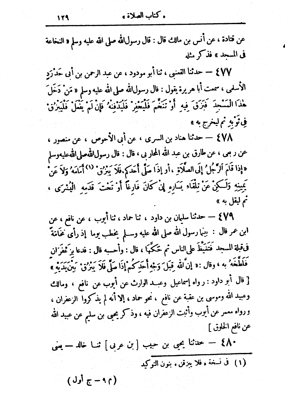 479 - حَدَّثَنَا سُلَيْمَانُ بْنُ دَاوُدَ، حَدَّثَنَا حَمَّادٌ، حَدَّثَنَا أَيُّوبُ، عَنْ نَافِعٍ، عَنِ ابْنِ عُمَرَ، قَالَ: بَيْنَمَا رَسُولُ اللَّهِ صَلَّى اللهُ عَلَيْهِ وَسَلَّمَ يَخْطُبُ يَوْمًا إِذْ رَأَى نُخَامَةً فِي قِبْلَةِ الْمَسْجِدِ فَتَغَيَّظَ عَلَى النَّاسِ، ثُمَّ حَكَّهَا، قَالَ: وَأَحْسَبُهُ قَالَ: فَدَعَا بِزَعْفَرَانٍ فَلَطَّخَهُ بِهِ، وَقَالَ: «إِنَّ §اللَّهَ قِبَلَ وَجْهِ أَحَدِكُمْ إِذَا صَلَّى، فَلَا يَبْزُقْ بَيْنَ يَدَيْهِ»، قَالَ أَبُو دَاوُدَ: رَوَاهُ إِسْمَاعِيلُ، وَعَبْدُ الْوَارِثِ، عَنْ أَيُّوبَ، عَنْ نَافِعٍ، وَمَالِكٍ، وَعُبَيْدِ اللَّهِ، وَمُوسَى بْنِ عُقْبَةَ، عَنْ نَافِعٍ، نَحْوَ حَمَّادٍ، إِلَّا أَنَّهُ لَمْ يَذْكُرُوا الزَّعْفَرَانَ، وَرَوَاهُ مَعْمَرٌ، عَنْ أَيُّوبَ، وَأَثْبَتَ الزَّعْفَرَانَ فِيهِ، وَذَكَرَ يَحْيَى بْنُ سُلَيْمٍ، عَنْ عُبَيْدِ اللَّهِ، عَنْ نَافِعٍ الْخَلُوقَ