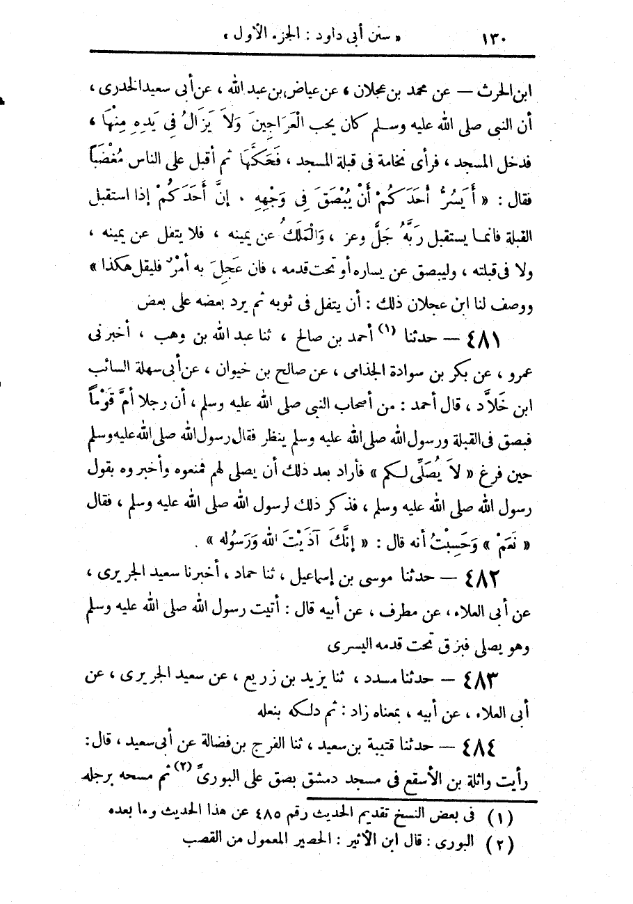 482 - حَدَّثَنَا مُوسَى بْنُ إِسْمَاعِيلَ، حَدَّثَنَا حَمَّادٌ، أَخْبَرَنَا سَعِيدٌ الْجُرَيْرِيُّ، عَنْ أَبِي الْعَلَاءِ، عَنْ مُطَرِّفٍ، عَنْ أَبِيهِ، قَالَ: «أَتَيْتُ رَسُولَ اللَّهِ صَلَّى اللهُ عَلَيْهِ وَسَلَّمَ وَهُوَ §يُصَلِّي فَبَزَقَ تَحْتَ قَدَمِهِ الْيُسْرَى»،