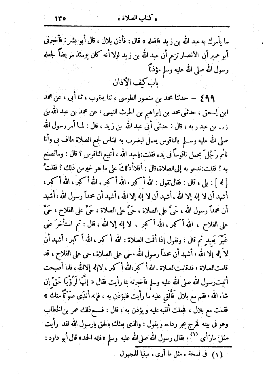 499 - حَدَّثَنَا مُحَمَّدُ بْنُ مَنْصُورٍ الطُّوسِيُّ، حَدَّثَنَا يَعْقُوبُ، حَدَّثَنَا أَبِي، عَنْ مُحَمَّدِ بْنِ إِسْحَاقَ، حَدَّثَنِي مُحَمَّدُ بْنُ إِبْرَاهِيمَ بْنِ الْحَارِثِ التَّيْمِيُّ، عَنْ مُحَمَّدِ بْنِ عَبْدِ اللَّهِ بْنِ زَيْدِ بْنِ عَبْدِ رَبِّهِ، قَالَ: حَدَّثَنِي أَبِي عَبْدُ اللَّهِ بْنُ زَيْدٍ، قَالَ: لَمَّا أَمَرَ رَسُولُ اللَّهِ صَلَّى اللهُ عَلَيْهِ وَسَلَّمَ بِالنَّاقُوسِ يُعْمَلُ لِيُضْرَبَ بِهِ لِلنَّاسِ لِجَمْعِ الصَّلَاةِ طَافَ بِي وَأَنَا نَائِمٌ رَجُلٌ يَحْمِلُ نَاقُوسًا فِي يَدِهِ، فَقُلْتُ: يَا عَبْدَ اللَّهِ أَتَبِيعُ النَّاقُوسَ؟ قَالَ: وَمَا تَصْنَعُ بِهِ؟ فَقُلْتُ: نَدْعُو بِهِ إِلَى الصَّلَاةِ، قَالَ: أَفَلَا أَدُلُّكَ عَلَى مَا هُوَ خَيْرٌ مِنْ ذَلِكَ؟ فَقُلْتُ لَهُ: بَلَى، قَالَ: فَقَالَ: تَقُولُ: §اللَّهُ أَكْبَرُ، اللَّهُ أَكْبَرُ، اللَّهُ أَكْبَرُ، اللَّهُ أَكْبَرُ، أَشْهَدُ أَنْ لَا إِلَهَ إِلَّا اللَّهُ، أَشْهَدُ أَنْ لَا إِلَهَ إِلَّا اللَّهُ، أَشْهَدُ أَنَّ مُحَمَّدًا رَسُولُ اللَّهِ، أَشْهَدُ أَنَّ مُحَمَّدًا رَسُولُ اللَّهِ، حَيَّ عَلَى الصَّلَاةِ، حَيَّ عَلَى الصَّلَاةِ، حَيَّ عَلَى الْفَلَاحِ، حَيَّ عَلَى الْفَلَاحِ، اللَّهُ أَكْبَرُ، اللَّهُ أَكْبَرُ، لَا إِلَهَ إِلَّا اللَّهُ، قَالَ: ثُمَّ اسْتَأْخَرَ عَنِّي غَيْرَ بَعِيدٍ، ثُمَّ، قَالَ: وَتَقُولُ: إِذَا أَقَمْتَ الصَّلَاةَ، اللَّهُ أَكْبَرُ اللَّهُ أَكْبَرُ، أَشْهَدُ أَنْ لَا إِلَهَ إِلَّا اللَّهُ، أَشْهَدُ أَنَّ مُحَمَّدًا رَسُولُ اللَّهِ، حَيَّ عَلَى الصَّلَاةِ، حَيَّ عَلَى الْفَلَاحِ، قَدْ قَامَتِ الصَّلَاةُ، قَدْ قَامَتِ الصَّلَاةُ، اللَّهُ أَكْبَرُ اللَّهُ أَكْبَرُ، لَا إِلَهَ إِلَّا اللَّهُ، فَلَمَّا أَصْبَحْتُ، أَتَيْتُ رَسُولَ اللَّهِ صَلَّى اللهُ عَلَيْهِ وَسَلَّمَ، فَأَخْبَرْتُهُ، بِمَا رَأَيْتُ فَقَالَ: «إِنَّهَا لَرُؤْيَا حَقٌّ إِنْ شَاءَ اللَّهُ، فَقُمْ مَعَ بِلَالٍ فَأَلْقِ عَلَيْهِ مَا رَأَيْتَ، فَلْيُؤَذِّنْ بِهِ، فَإِنَّهُ أَنْدَى صَوْتًا مِنْكَ» فَقُمْتُ مَعَ بِلَالٍ، فَجَعَلْتُ أُلْقِيهِ عَلَيْهِ، وَيُؤَذِّنُ بِهِ، قَالَ: فَسَمِعَ ذَلِكَ عُمَرُ بْنُ الْخَطَّابِ، وَهُوَ فِي بَيْتِهِ فَخَرَجَ يَجُرُّ رِدَاءَهُ، وَيَقُولُ: وَالَّذِي بَعَثَكَ بِالْحَقِّ يَا رَسُولَ اللَّهِ، لَقَدْ رَأَيْتُ -[136]- مِثْلَ مَا رَأَى، فَقَالَ رَسُولُ اللَّهِ صَلَّى اللهُ عَلَيْهِ وَسَلَّمَ: «فَلِلَّهِ الْحَمْدُ» قَالَ أَبُو دَاوُدَ: هَكَذَا رِوَايَةُ الزُّهْرِيِّ، عَنْ سَعِيدِ بْنِ الْمُسَيِّبِ، عَنْ عَبْدِ اللَّهِ بْنِ زَيْدٍ، وَقَالَ: فِيهِ ابْنُ إِسْحَاقَ، عَنِ الزُّهْرِيِّ: اللَّهُ أَكْبَرُ، اللَّهُ أَكْبَرُ، اللَّهُ أَكْبَرُ، اللَّهُ أَكْبَرُ، وَقَالَ مَعْمَرٌ، وَيُونُسُ، عَنِ الزُّهْرِيِّ فِيهِ: اللَّهُ أَكْبَرُ، اللَّهُ أَكْبَرُ، لَمْ يُثَنِّيَا