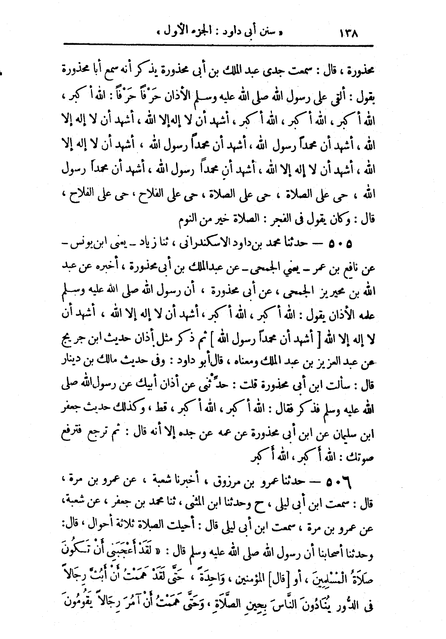 505 - حَدَّثَنَا مُحَمَّدُ بْنُ دَاوُدَ الْإِسْكَنْدَرَانِيُّ، حَدَّثَنَا زِيَادٌ يَعْنِي ابْنَ يُونُسَ، عَنْ نَافِعِ بْنِ عُمَرَ يَعْنِي الْجُمَحِيَّ، عَنْ عَبْدِ الْمَلِكِ بْنِ أَبِي مَحْذُورَةَ، أَخْبَرَهُ عَنْ عَبْدِ اللَّهِ بْنِ مُحَيْرِيزٍ الْجُمَحِيِّ، عَنْ أَبِي مَحْذُورَةَ، أَنَّ رَسُولَ اللَّهِ صَلَّى اللهُ عَلَيْهِ وَسَلَّمَ عَلَّمَهُ الْأَذَانَ يَقُولُ: «اللَّهُ أَكْبَرُ اللَّهُ أَكْبَرُ، أَشْهَدُ أَنْ لَا إِلَهَ إِلَّا اللَّهُ، أَشْهَدُ أَنْ لَا إِلَهَ إِلَّا اللَّهُ»، ثُمَّ ذَكَرَ مِثْلَ أَذَانِ حَدِيثِ ابْنِ جُرَيْجٍ، عَنْ عَبْدِ الْعَزِيزِ بْنِ عَبْدِ الْمَلِكِ، وَمَعْنَاهُ، قَالَ أَبُو دَاوُدَ: وَفِي حَدِيثِ مَالِكِ بْنِ دِينَارٍ، قَالَ: سَأَلْتُ ابْنَ أَبِي مَحْذُورَةَ، قُلْتُ: حَدِّثْنِي عَنْ أَذَانِ أَبِيكَ، عَنْ رَسُولِ اللَّهِ صَلَّى اللهُ عَلَيْهِ وَسَلَّمَ، فَذَكَرَ، فَقَالَ: «اللَّهُ أَكْبَرُ، اللَّهُ أَكْبَرُ»، قَطْ، وَكَذَلِكَ حَدِيثُ جَعْفَرِ بْنِ سُلَيْمَانَ، عَنِ ابْنِ أَبِي مَحْذُورَةَ، عَنْ عَمِّهِ، عَنْ جَدِّهِ، إِلَّا أَنَّهُ قَالَ: " ثُمَّ تَرْجِعُ فَتَرْفَعُ صَوْتَكَ: اللَّهُ أَكْبَرُ، اللَّهُ أَكْبَرُ "